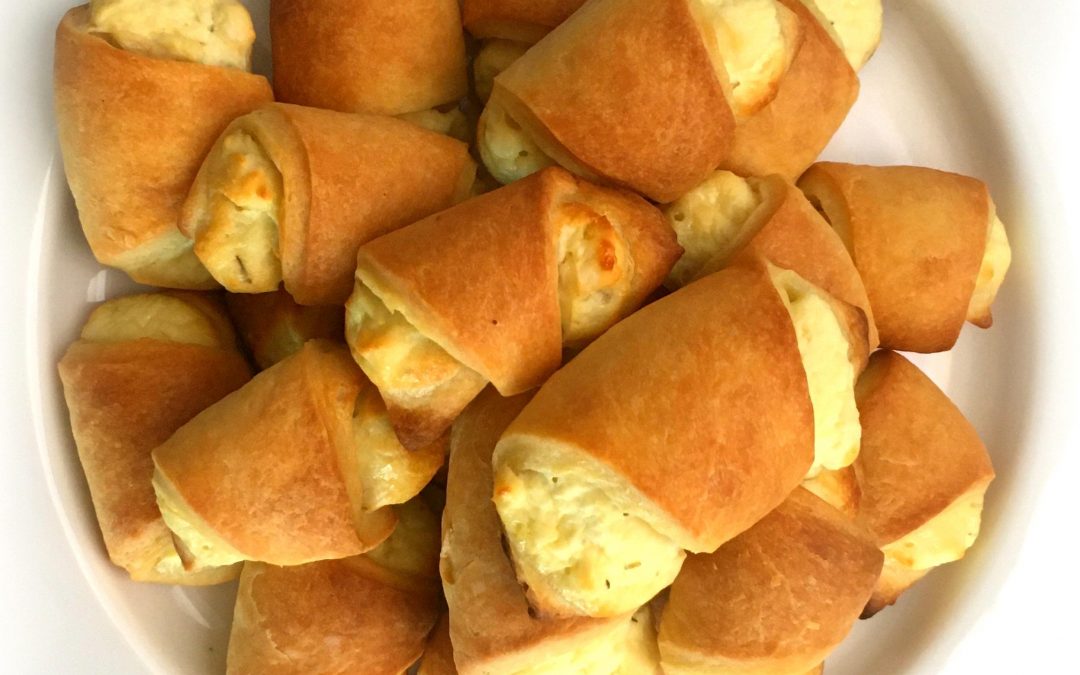 Κόψτε σε τρίγωνα και τοποθετήστε 1 κουταλάκι του γλυκού γέμιση στο φαρδύ άκρο του κάθε τριγώνου και στη συνέχεια κυλήστε από το φαρδύ άκρο μέχρι το αιχμηρό άκρο,