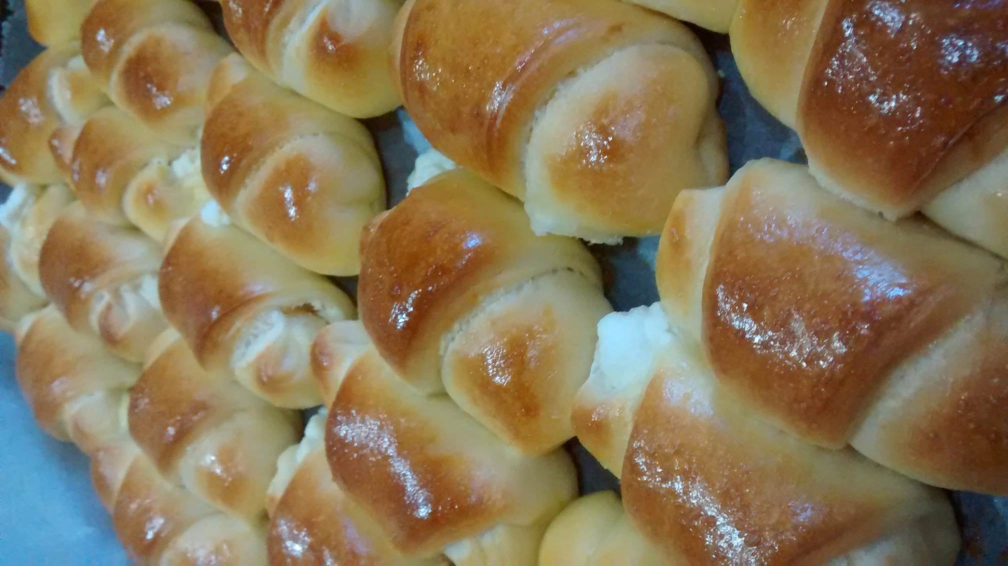 Φρεσκοψημένα Τυροπιτάκια-κρουασανάκια, στρουμπουλά κι αφράτα, με χρυσαφένια κρούστα, τοποθετημένα σε ταψί.