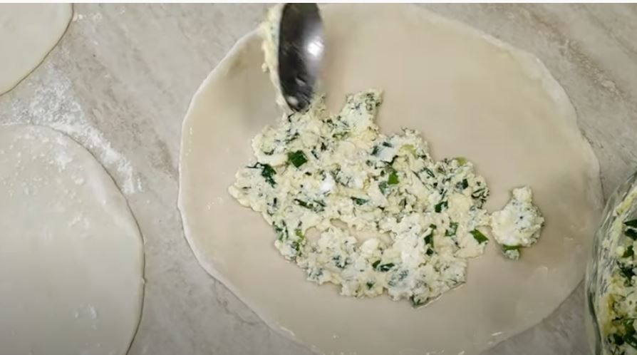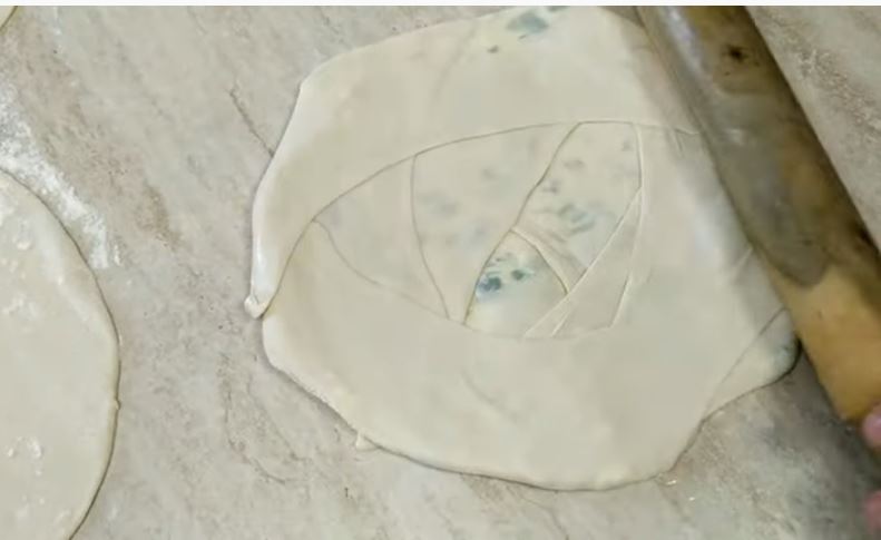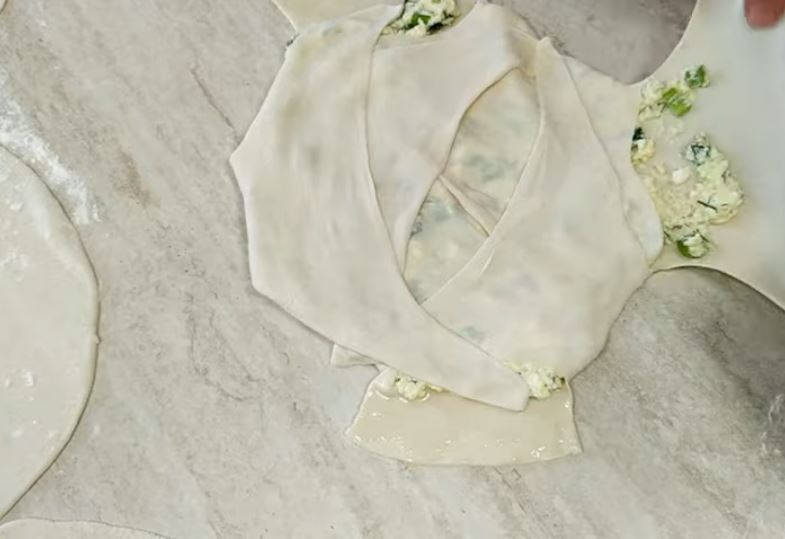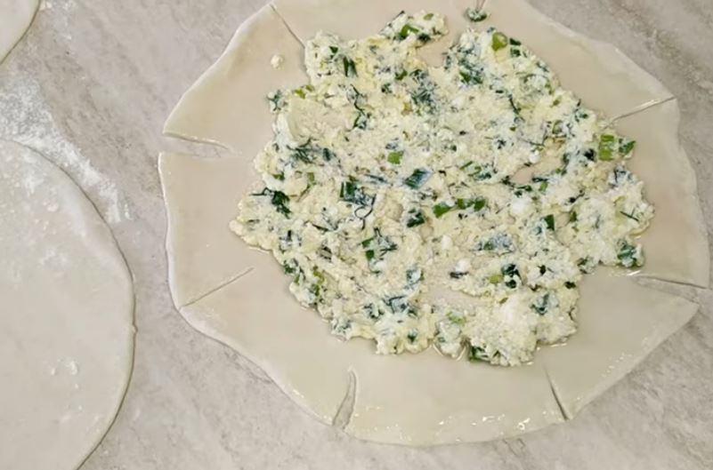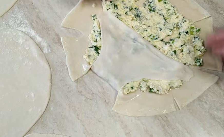 Χαράζουμε γύρω γύρω με ένα μαχαίρι τις πίτες και ξεκινάμε και καλύπτουμε την γέμιση όπως βλέπετε στη φωτογραφία,