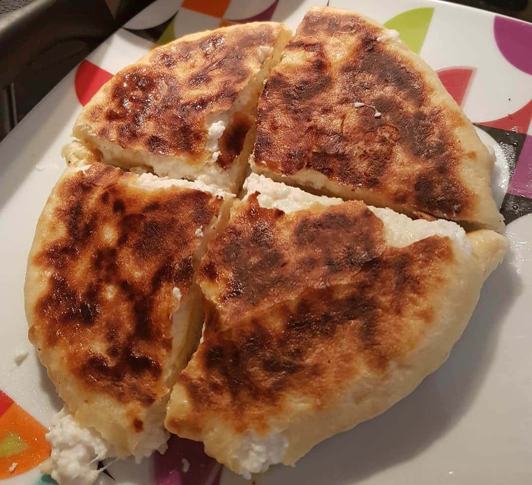 Οταν είναι έτοιμη η ζύμη, τη χωρίζουμε σε 6 μερίδες τη καθε μερίδα ανοίγουμε με την παλαμη μας πίτουλα οχι πολη μεγάλη στη μέση βάζουμε το τυρί κ μαζεύουμε γύρο γύρο τη ζύμη κ γινετε σαν μπάλα μικρή το γυρίζουμε αναποδα βάζουμε λίγο αλευρι και ανοίγουμε