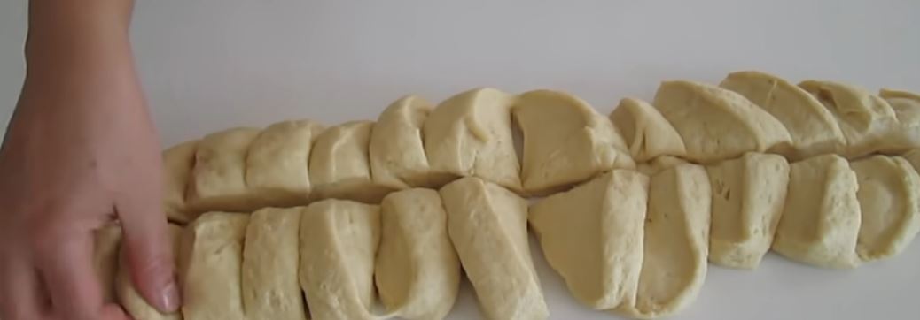 Μόλις φουσκώσει καλά την βγάζουμε στον πάγκο και την κάνουμε ένα μανίκι και χωρίζουνε οριζόντια στα 2 και κάθετα στα 14 κομμάτια.