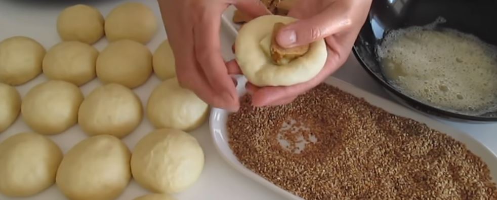Στην συνέχεια ανοίγουμε το πρώτο μπαλάκι σε πιτακι βαζουμε μέσα ένα κομματάκι τυρί και ένα κομματάκι λουκάνικο και το κλεινουμε σε μπαλα παλι