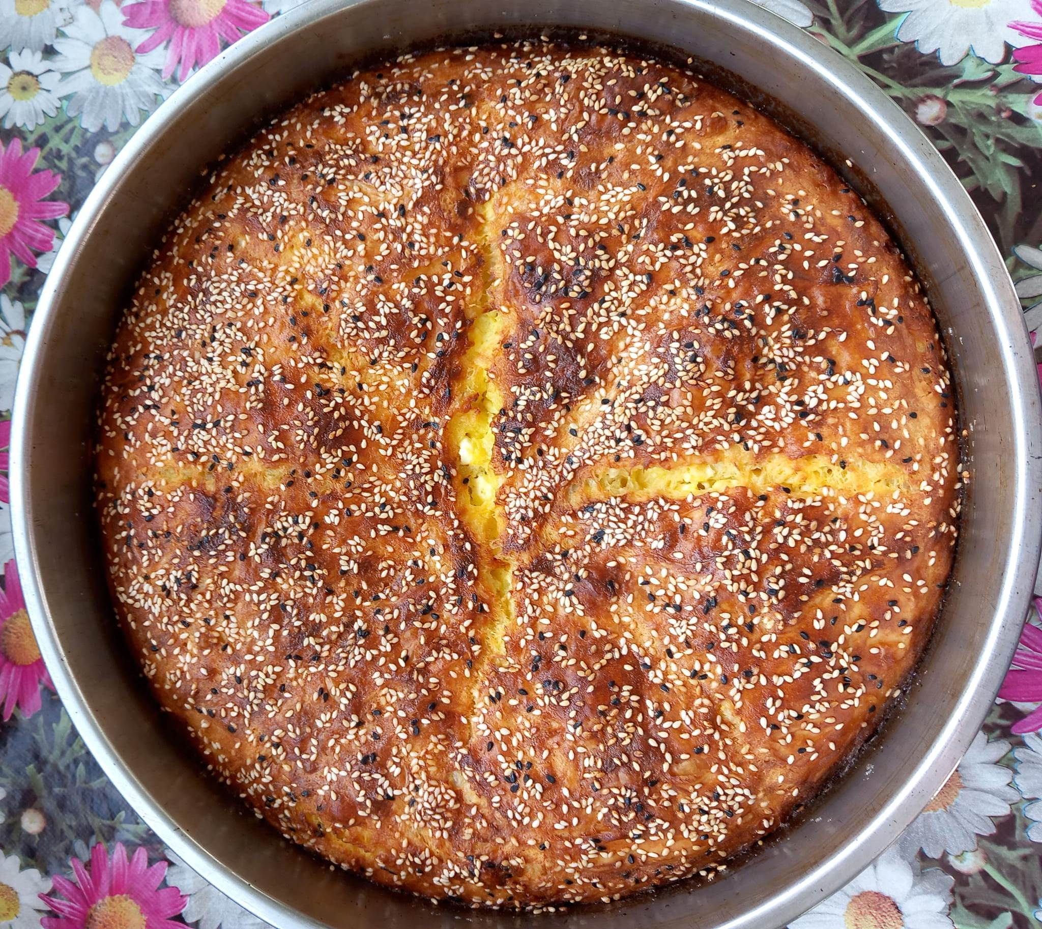 Σκεπάστε με το φύλλο που έχετε κρατήσει. Στο βίντεο χτύπησα κι άλλο αυγό με μια κουταλιά γιαούρτι και το άλειψα. Δεν είναι απαραίτητο, αν έχει περισσέψει λίγος χυλός. Αντί να τον ρίξετε μέσα στην πίτα, κρατείστε τον και απλώστε τον πάνω στο φύλλο της κορυφής.