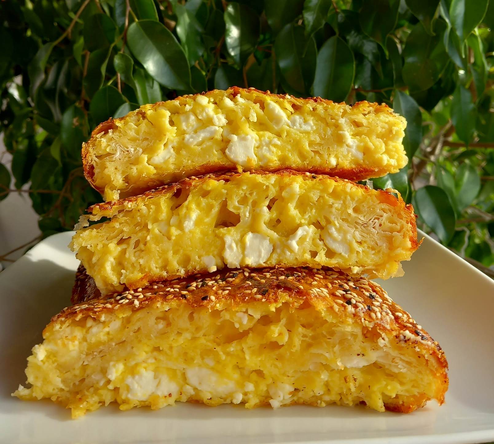 Χτυπήστε σε μπολ τα αυγά, το γιαούρτι, το νερό, το λάδι & το baking powder. Προσθέστε το τρίμμα τυριού και ανακατέψτε. Αλατίστε ανάλογα με το τυρί και το γούστο σας. Μπορείτε να προσθέσετε μαύρο πιπέρι, αν η φέτα δεν είναι πολύ πικάντικη ή 2 κουταλιές φρέσκο κρεμμυδάκι κια 2 κουταλιά άνιθο ψιλοκομμένα.