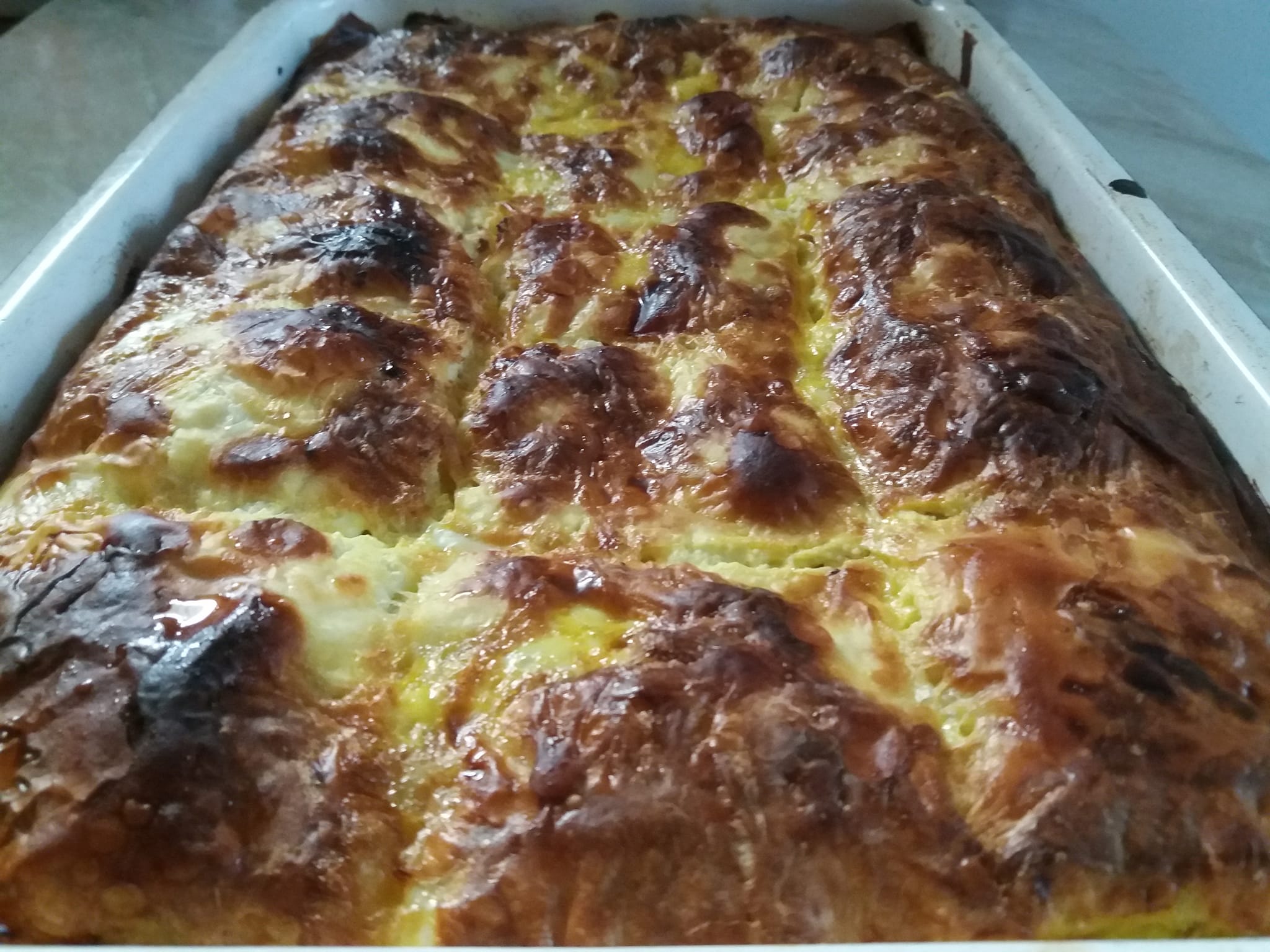 Μόλις είναι έτοιμο, περιχύνουμε με το μείγμα αυγού-γάλακτος. Ανακινούμε προσεκτικά το ταψί ώστε η επικάλυψη να απλωθεί παντού ομοιόμορφα και βάζουμε την πίτα να ψηθεί σε προθερμασμένο φούρνο στους 180°C για 60 λεπτά μέχρι να ροδίσει ορεκτικά.