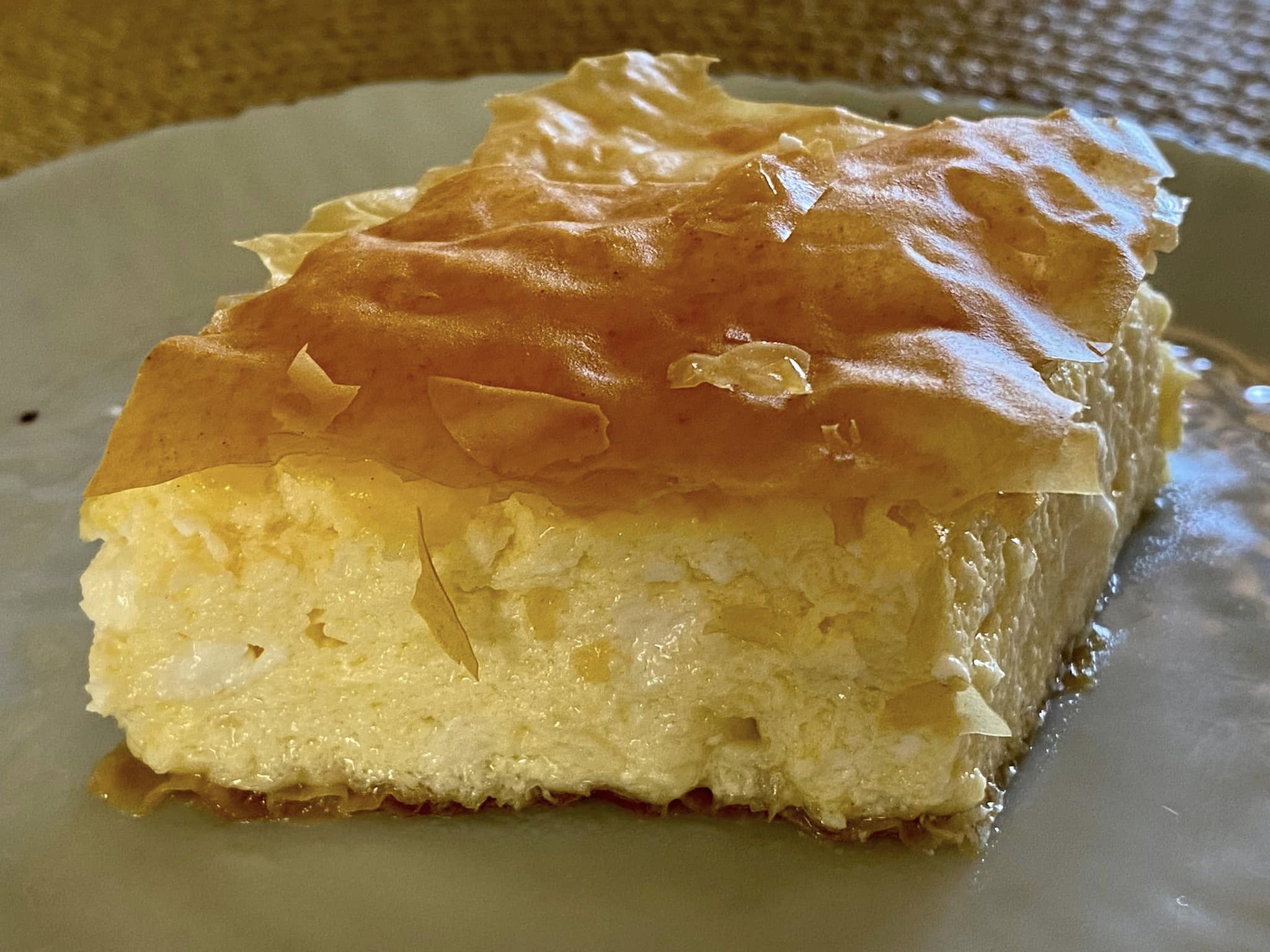 Αλείφουμε την επιφάνεια της τυρόπιτας με βούτυρο και κατόπιν με το αυγό.