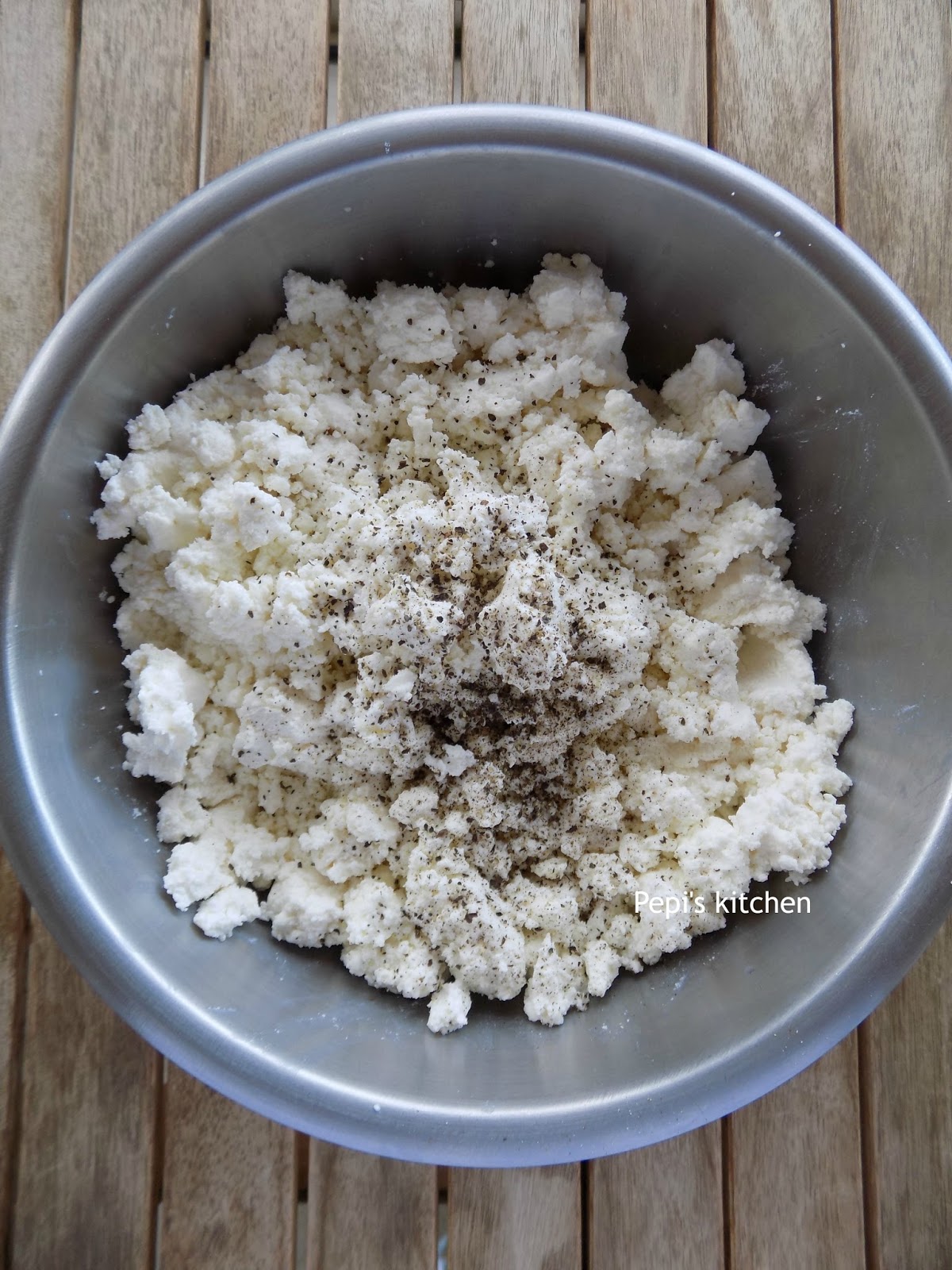 Σ’ ένα μεγάλο μπωλ θρυμματίζετε τα τυριά μ’ ένα πιρούνι, προσθέτετε μπόλικο πιπέρι και ανακατεύετε.