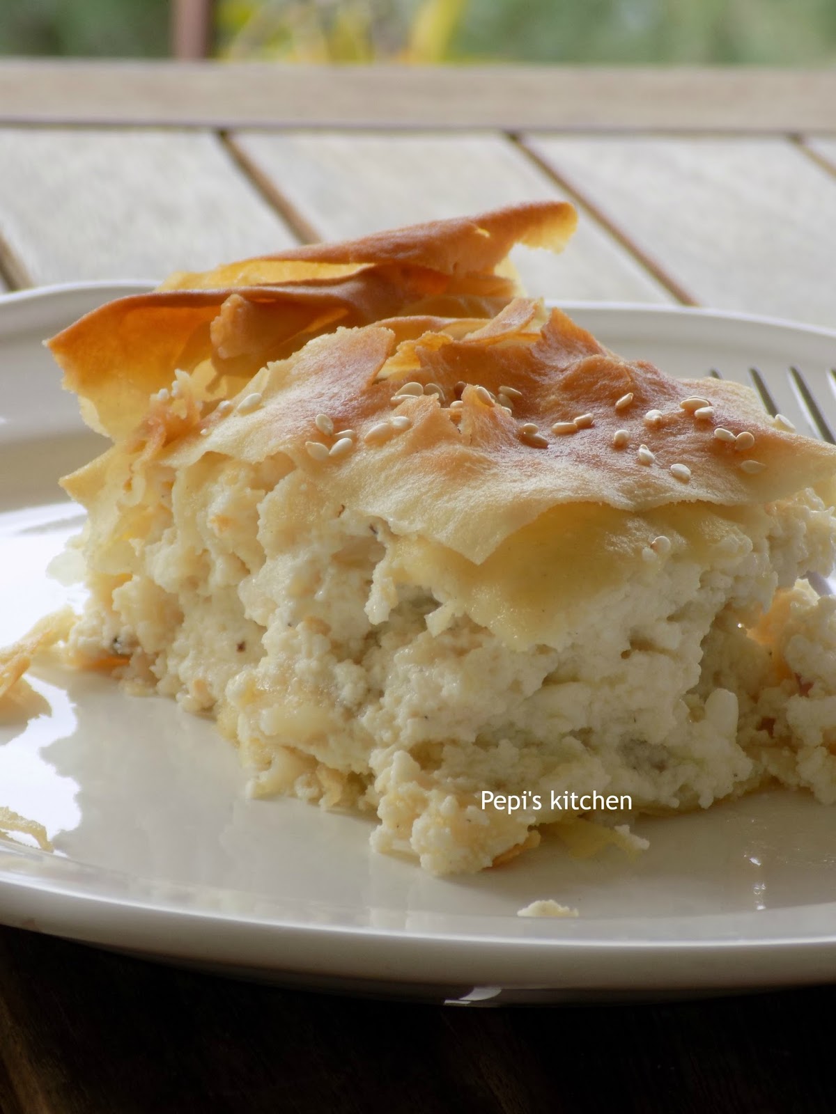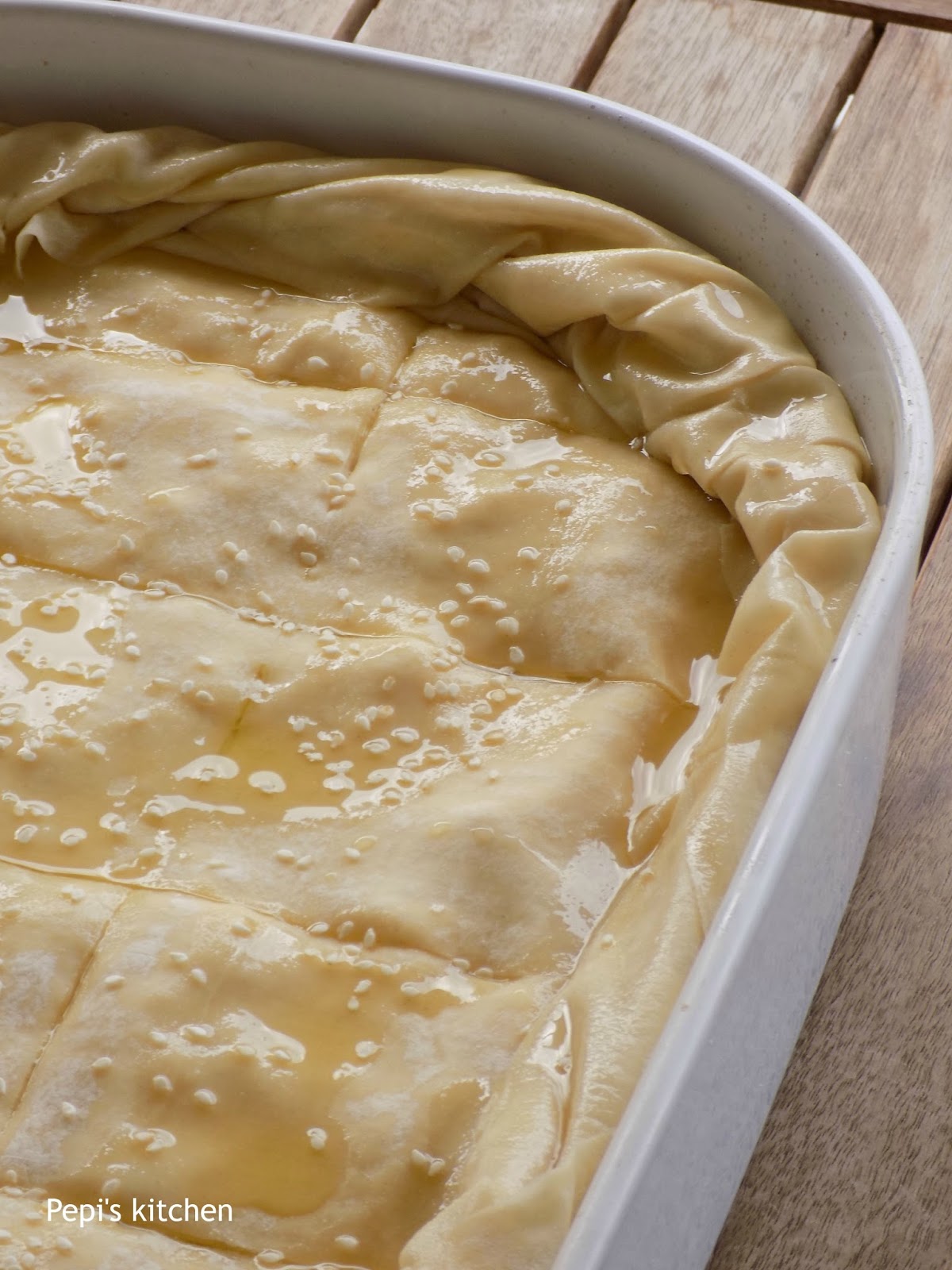 Αλείφετε με ελαιόλαδο ένα ταψί 30×40εκ και στρώνετε το ένα φύλλο. Αλείφετε με λάδι και στρώνετε το δεύτερο φύλλο. Ρίχνετε τη γέμιση και την ισιώνετε με το πίσω μέρος ενός κουταλιού. Σκεπάζετε με τα υπόλοιπα δύο φύλλα καλά λαδωμένα ενδιάμεσα. Γυρνάτε τις άκρες προς τα μέσα. Αλείφετε το πάνω φύλλο με ελαιόλαδο και χαράζετε την πίτα σε κομμάτια. Πασπαλίζετε με σουσάμι.