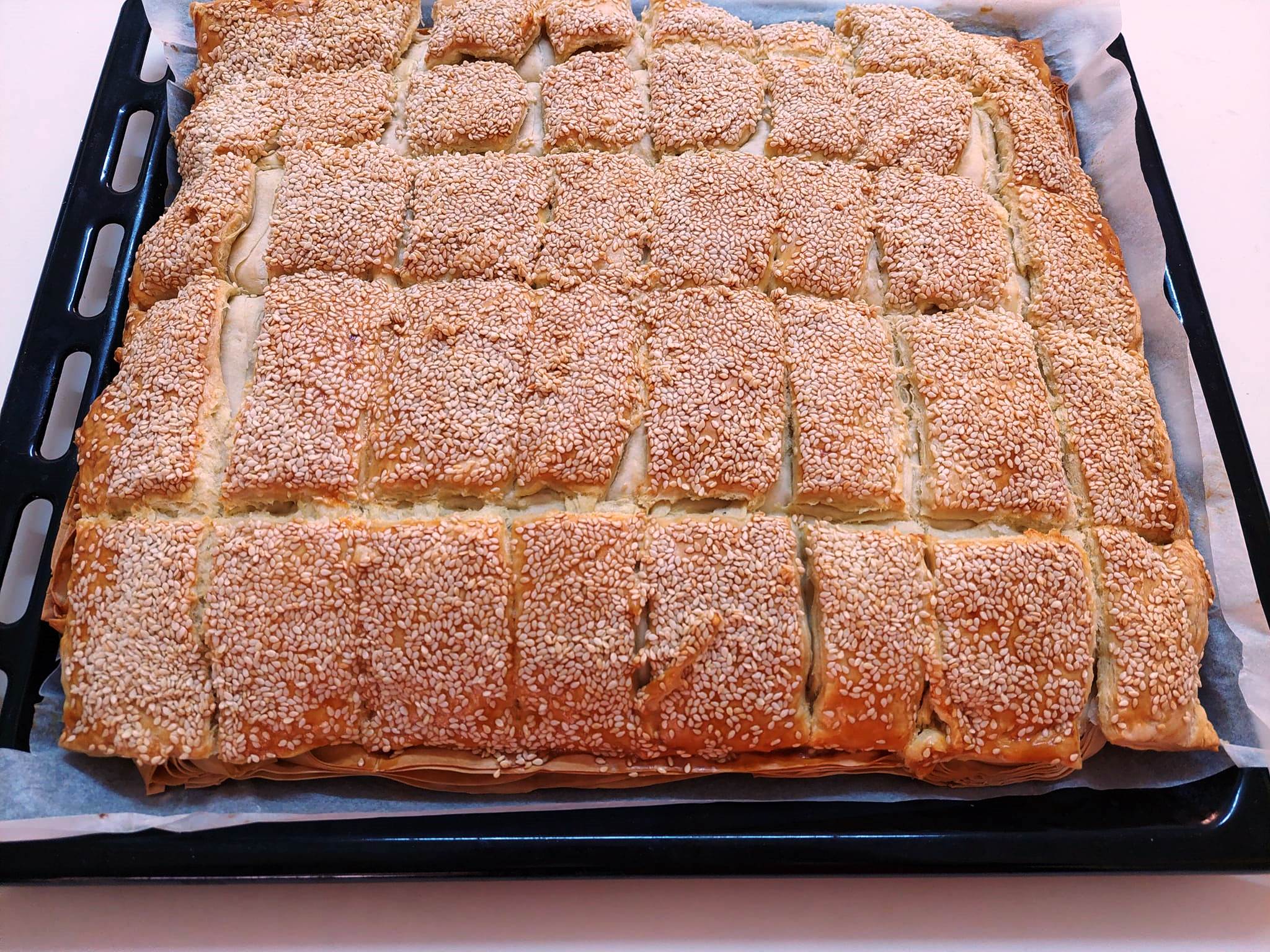 Εγώ πάνω τα τυριά έκανα λίγη μπεσαμέλ την έριξα πάνω στα τυριά με προσοχή έβαλα από πάνω το δεύτερο φύλλο το άλειψα με αυγό πασπαλισα σουσάμι το χάραξα και το έψησε την πίτα στους 160 βαθμούς για 30 με 40 λεπτά