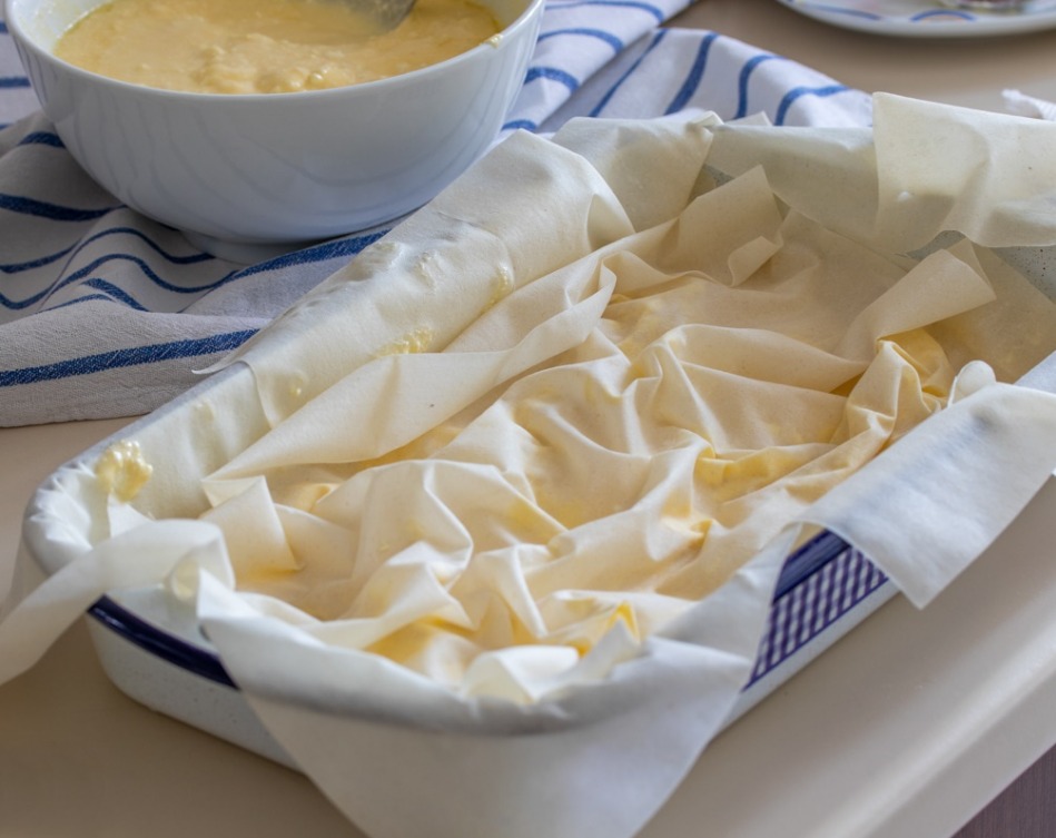 Απλώνουμε δύο φύλλα στο ταψί μας όπως βλέπουμε στην φωτό
