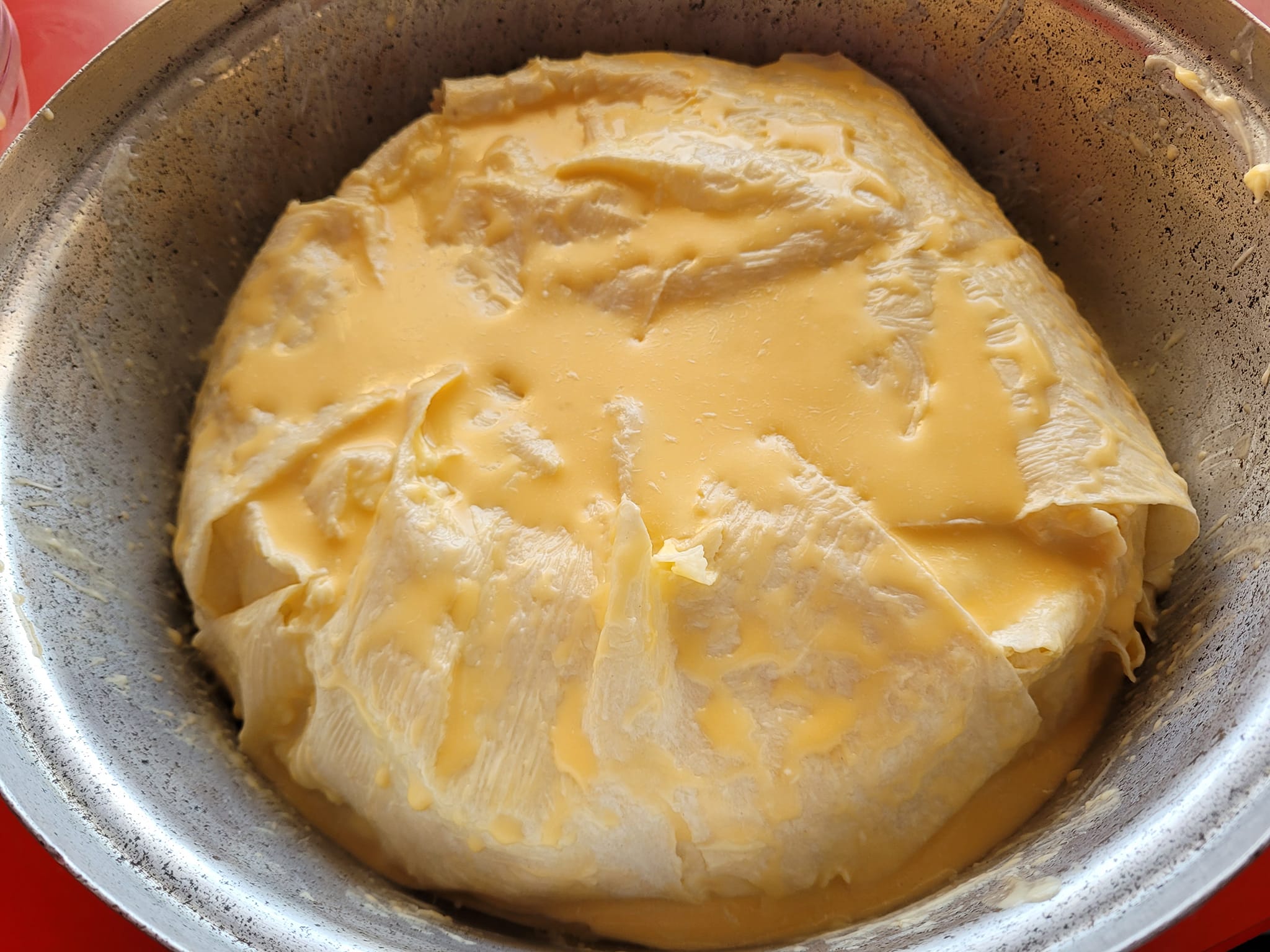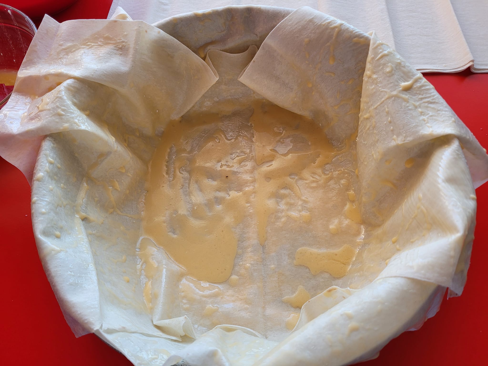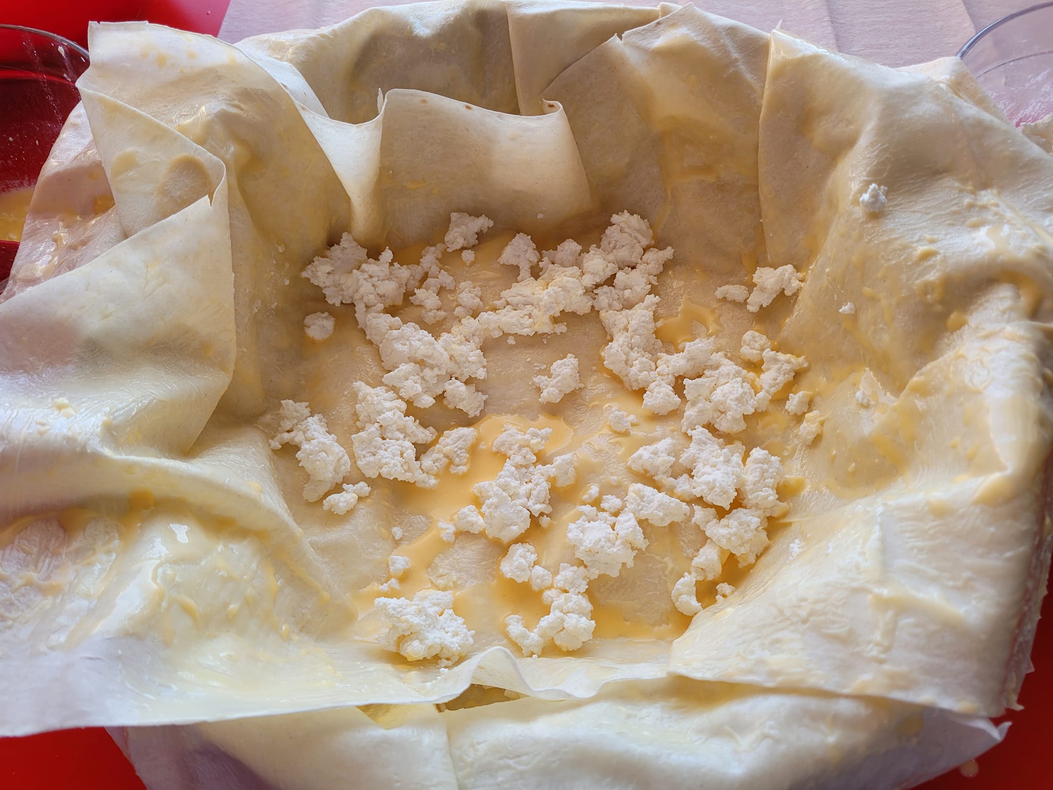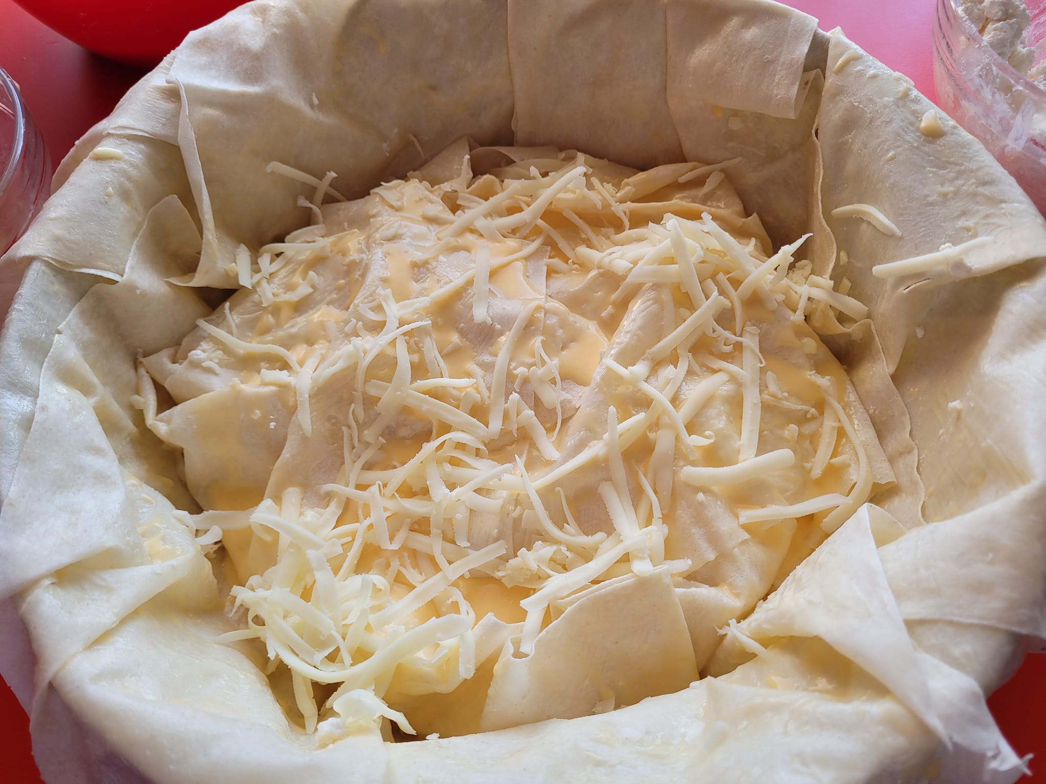 Μετά πάλι δύο φύλλα και τυρί. Έκανα εναλλάξ μέχρι να τελειώσουν τα φύλλα. Έκλεισα τα εσωτερικά φύλλα, τα λαδώνω, και πασπάλισμα με το μείγμα αυγών και λίγη από τη γέμιση, εναλλάξ τυρί και κίτρινο τυρί.