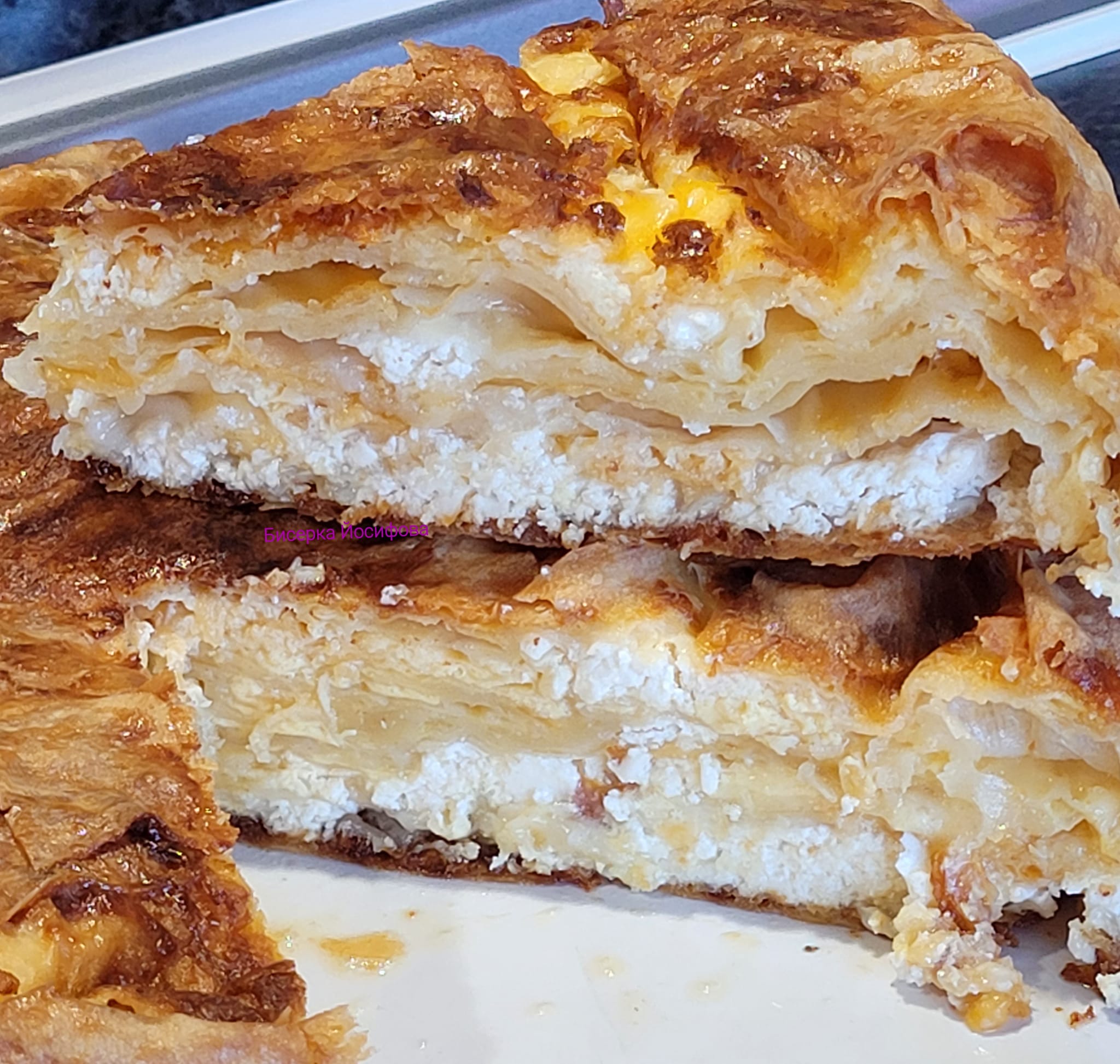 Με τον ίδιο τρόπο στρώνω και δεύτερο φύλλο, το οποίο το έβαλα σε σταυρό. Έβαλα ένα τρίτο και πασπάλισα με τυρί.