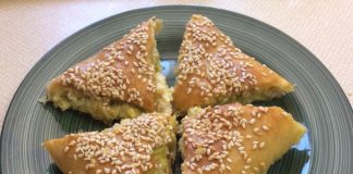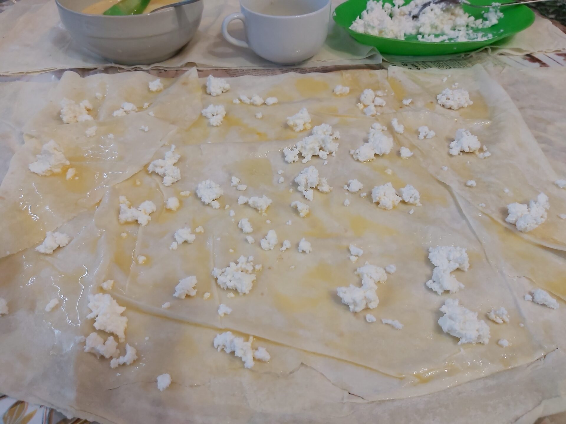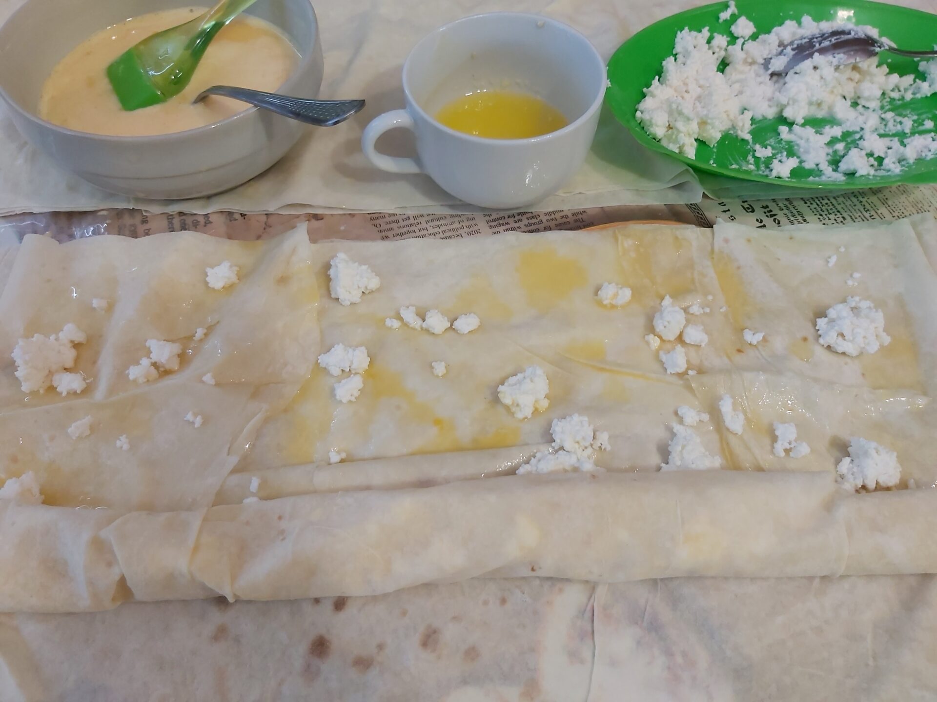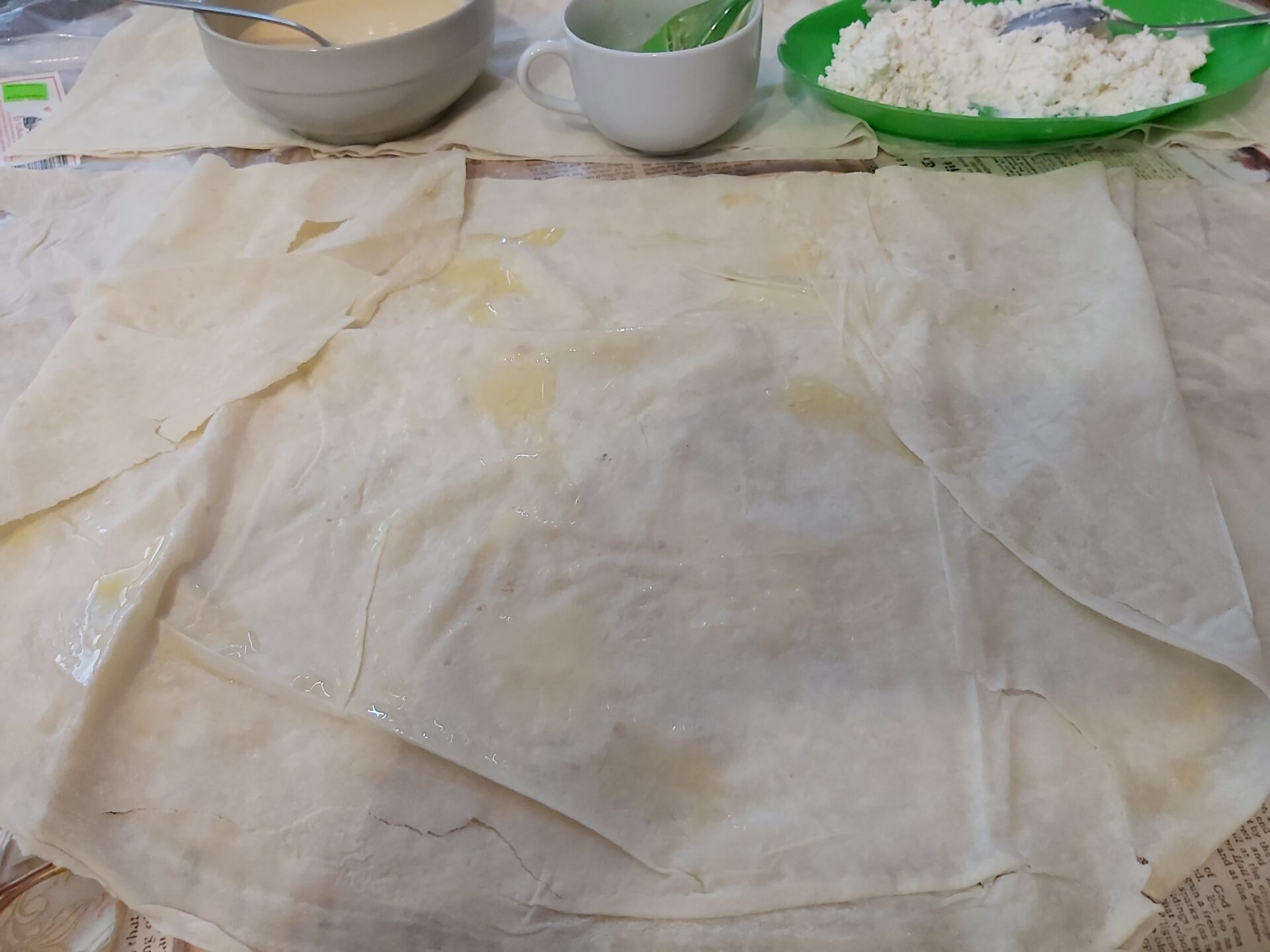 Τα φύλλα απλώνονται σε τραπέζι ή πάγκο κουζίνας και κόβονται στη μέση με τη βοήθεια ενός μαχαιριού πίτσας. Κάθε μισό αλείφεται με λιωμένο βούτυρο.