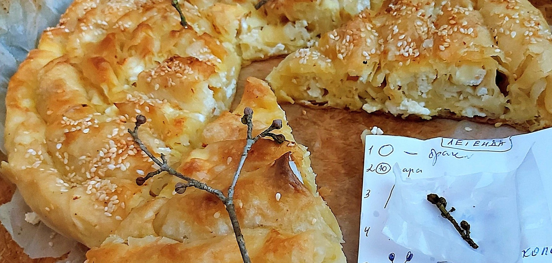 Η πίτα κόβεται σε 8 κομμάτια, και σε κάθε κομμάτι τοποθετείται ένα κομμάτι τύχης – ένα κλαδάκι με μπουμπούκια σκυλόξυλο και