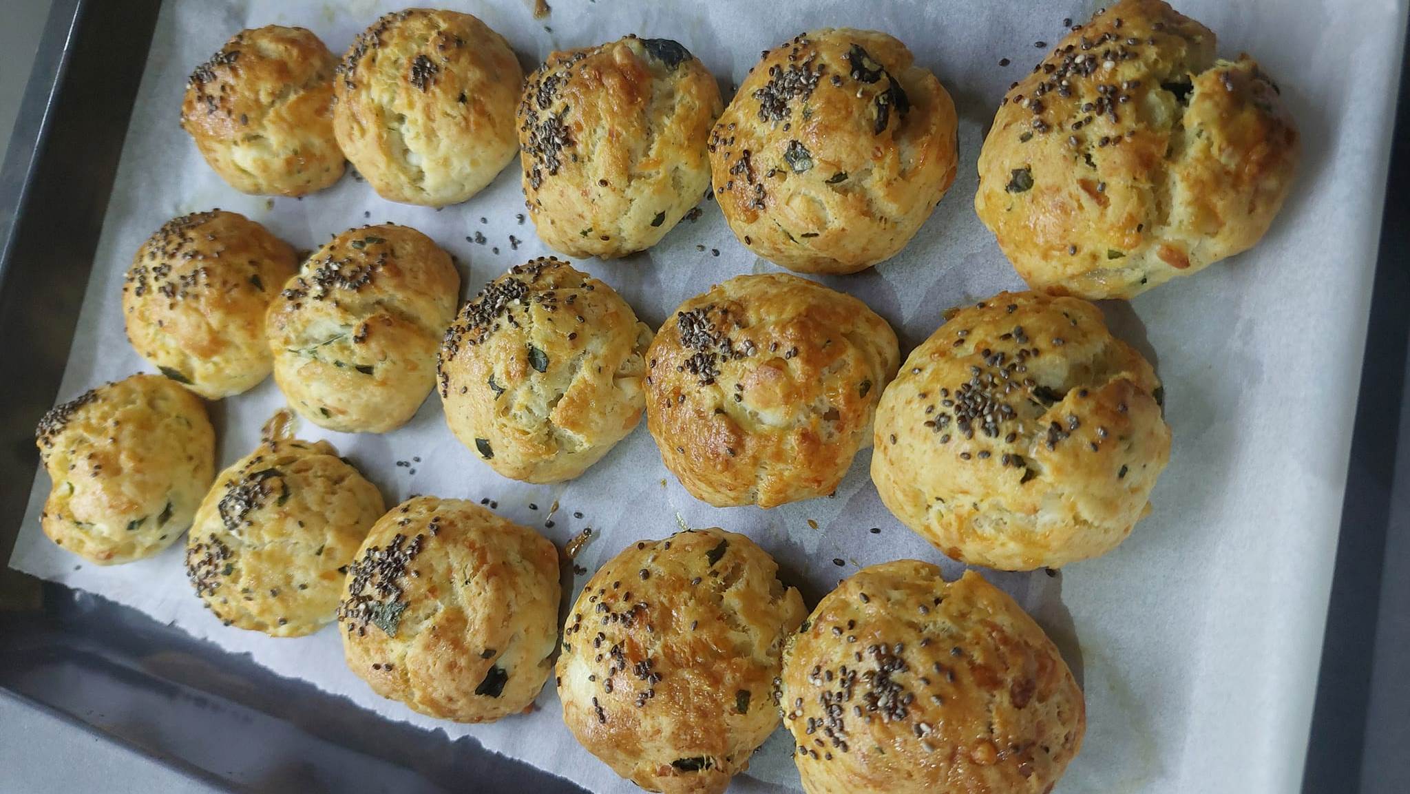 Πάρτε μικρές ποσότητες ζύμης (περίπου 30 γραμμάρια η καθεμία) και πλάστε τις σε μπαλάκια. Τοποθετήστε τα μπαλάκια στο ταψί, αφήνοντας λίγο χώρο μεταξύ τους.
