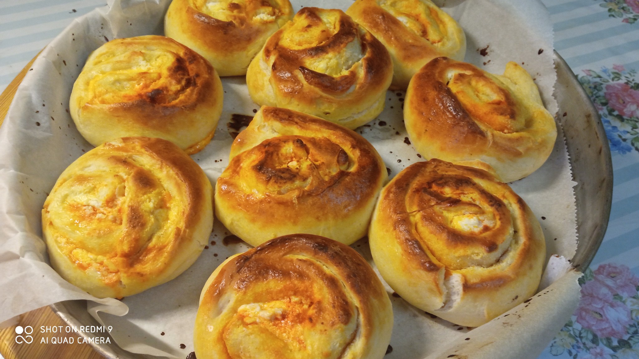 Παίρνω ένα ταψί, το στρώνω με λαδόκολλα και τοποθετώ τα κομμάτια. Μπορώ να τα αφήσω στρογγυλά σαν αφράτα ψωμάκια ή να τα πατήσω ελαφρά με το χέρι μου να γίνουν πιο πλακέ, σαν τυρόπιτες.