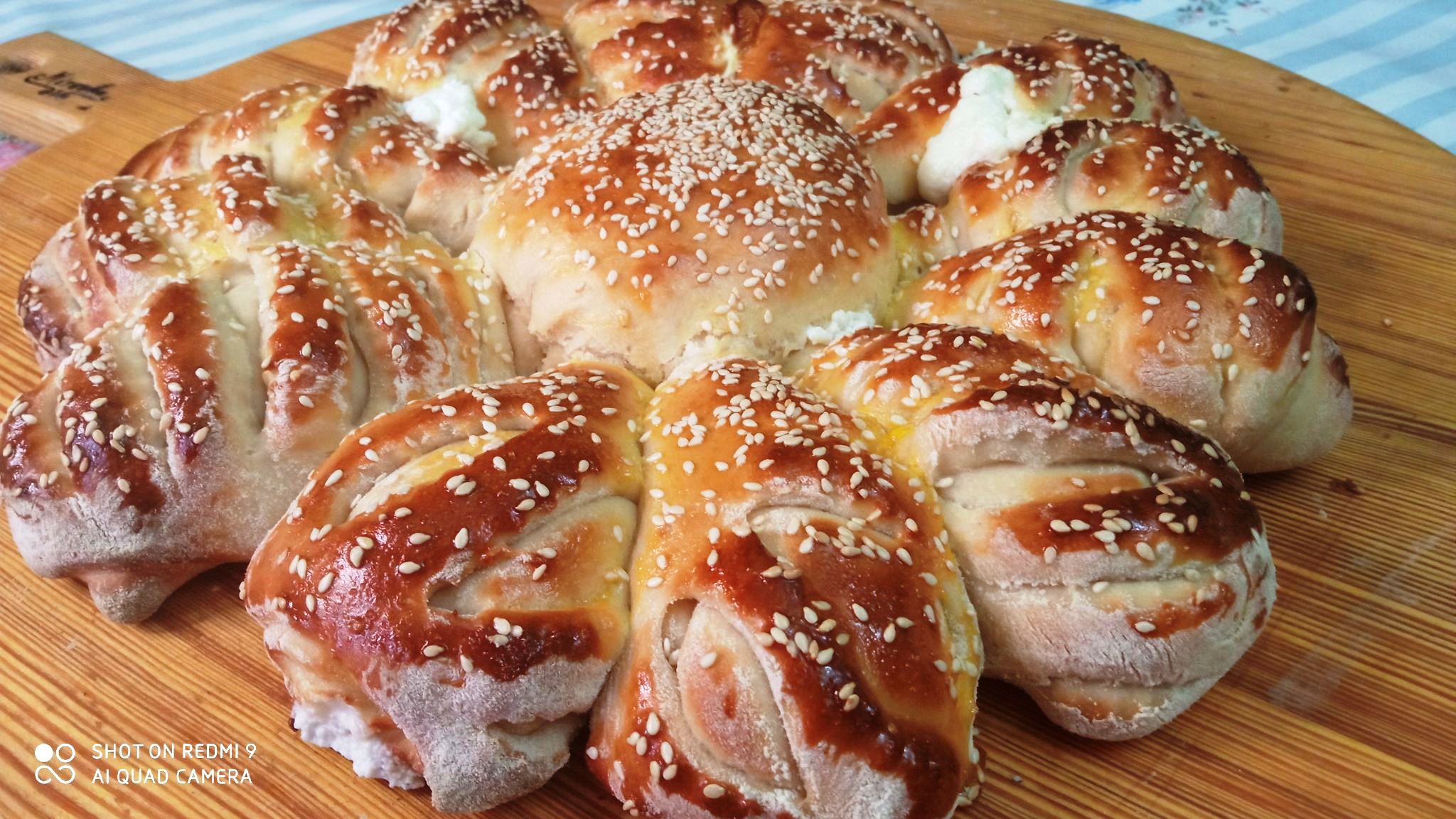 Τοποθετήστε τα φυλλα μαργαριτας σε ένα ταψί με λαδόκολλα γυρω γυρω απο μια κεντρική μπαλιτσα που φτιαχνουμε με μια ζυμη