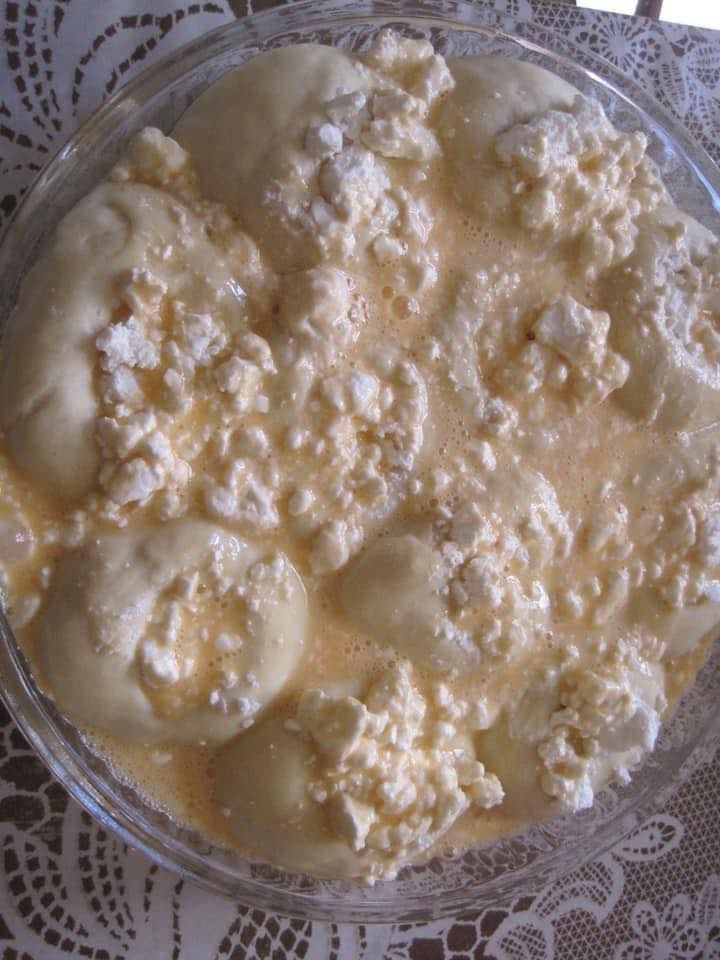 - Μόλις τα ζυμαράκια μου έχουν φουσκώσει για δεύτερη φορά, τα περιχύνω με το μείγμα του γιαουρτιού και των αυγών.