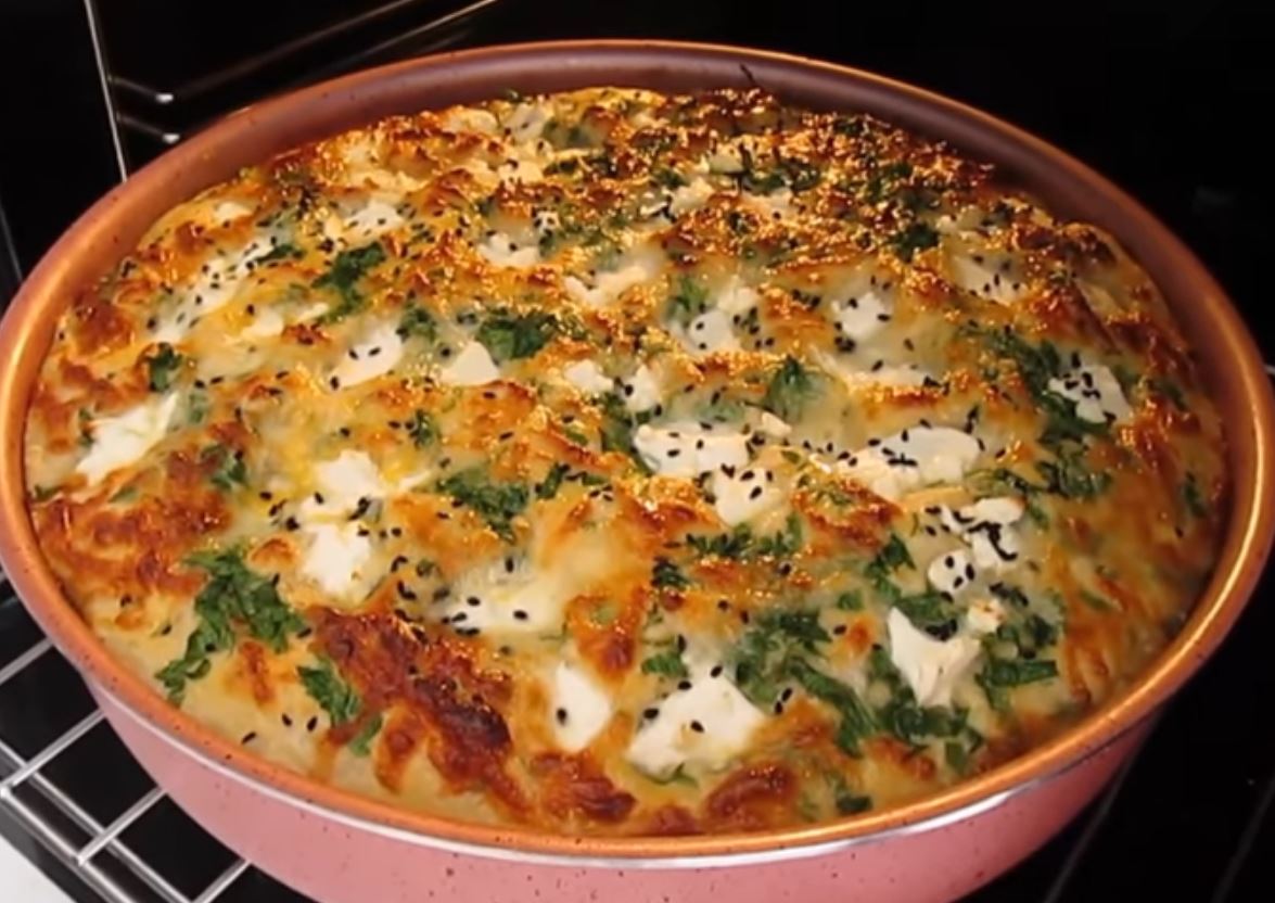Από πάνω απλώνουμε την υπόλοιπη ζύμη, αλείφουμε με κρόκο αυγού και ρίχνουμε μαϊντανό, τσενταρ και φέτα και πασπαλίζουμε με σουσάμι.