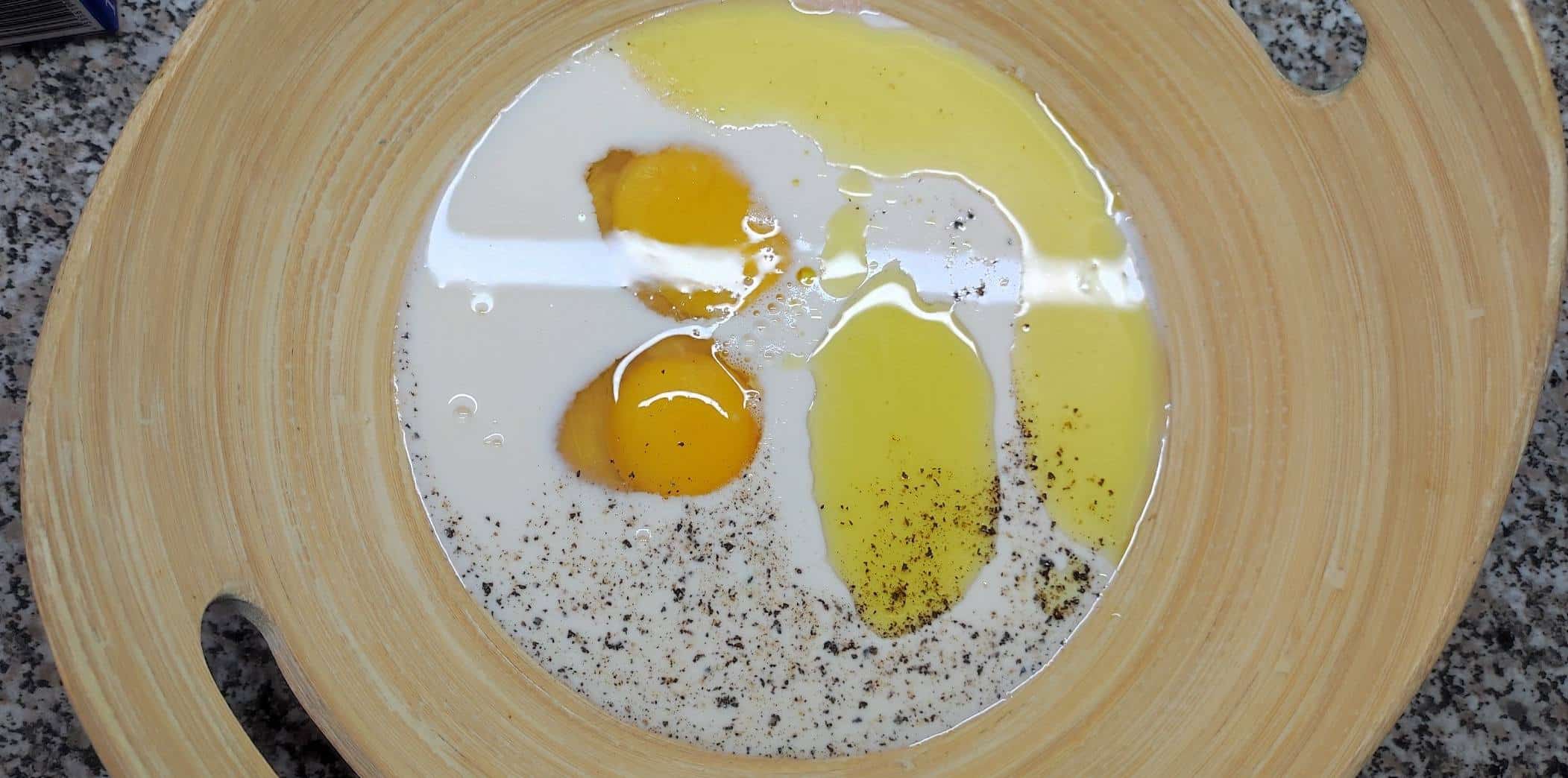 Χτυπάμε πρώτα όλα τα υγρά υλικά μαζί (γάλα, αυγά, ελαιόλαδο) μέχρι να ομογενοποιηθούν.