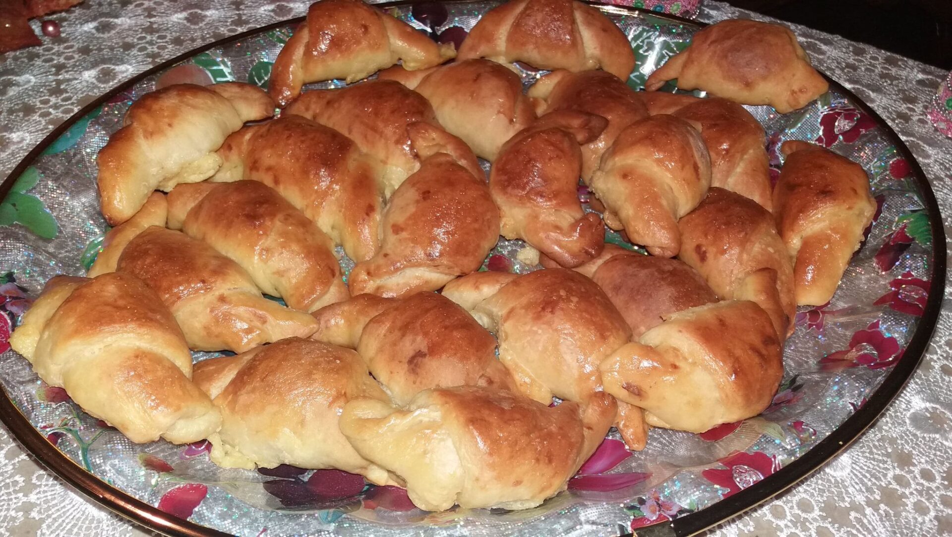 Στη συνέχεια αφού φουσκώσει η ζύμη μας την ξαναζυμώνουμε και τη χωρίζουμε σε 8 μέρη.Ανοίγουμε με τη βοήθεια του πλάστη το κάθε κομμάτι ζύμης μας σε λεπτό φύλλο.Το χαράζουμε όπως κόβουμε τη πίτσα σε 8 κομμάτια.Βάζουμε στην άκρη από το φαρδύ μέρος της ζύμης μια κουταλιά από το μείγμα των τυριών και το τυλίγουμε σαν κρουασανάκι .