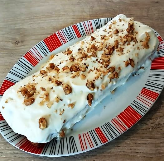 Απλώνουμε το γλάσο ομοιόμορφα πάνω στο κρύο κέικ, πασπαλίζουμε με τα τριμμένα καρύδια για γαρνίρισμα και το βάζουμε στο ψυγείο για να σταθεροποιηθεί το γλάσο.