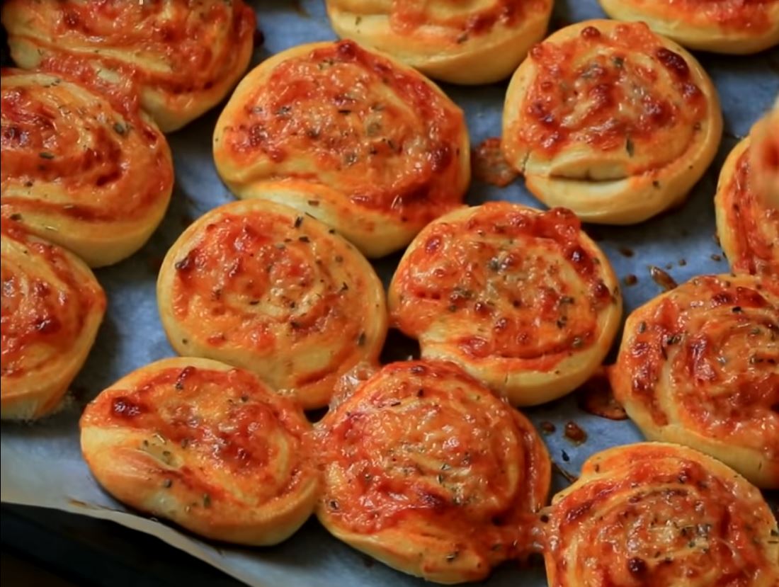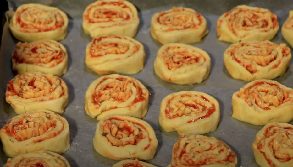 Χτυπάμε το αυγό με μια κουταλιά της σούπας λάδι και επικαλύπτουμε τα πιτσάκια. Ψήνεται σε προθερμασμένο φούρνο στους 240 βαθμούς για περίπου 15 λεπτά. Παίρνετε περίπου 30 μεγάλα πιτσάκια, και αν τα κάνετε για γενέθλια ή παρόμοιες περιστάσεις, φτιάξτε μικρότερα κομμάτια. Σε αυτήν την περίπτωση, θα λάβετε περίπου 60 μίνι πιτσάκια.