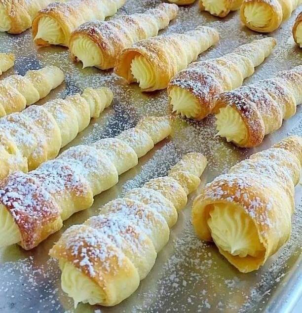 Τώρα δεν έχουμε παρά να γεμίσουμε τα σωληνάρια με κρέμα, να τα πασπαλίσουμε με ζάχαρη άχνη και να σερβίρουμε το γλυκό στο τραπέζι.⠀