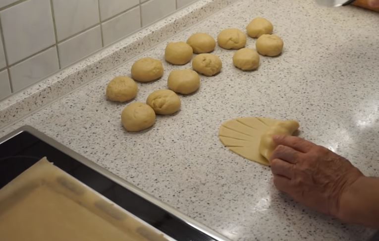Μετά από 1 ώρα βγάζουμε την ζύμη στο πάγκο μας ζυμώνουμε ελαφρα και φτιαχνουμε ένα μακρόστενο ρολό. Χωρίζουμε την ζύμη σε 13 κομμάτια και πλάθετε σε μικρές μπάλες