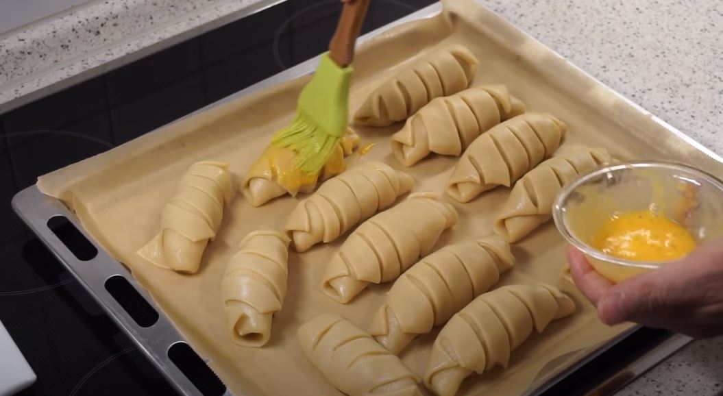 Τοποθετήστε τα κρουασανάκια σε ένα ταψί στρωμένο με χαρτι ψησίματος και αλείψτε τα με ένας κρόκο αυγού.