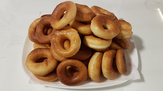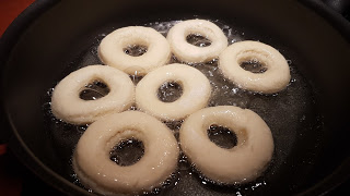 Στη συνέχεια, ανοίξτε τεντώνοντας μια κρούστα με πάχος περίπου 1 cm και χρησιμοποιώντας μία κούπα, κόψτε τους κύκλους και με ένα μικρό ποτηράκι για ρακί, κάντε τις μικρότερες τρύπες στο κέντρο. Χρησιμοποίησα ένα καπάκι για να κόψω τους μικρούς κύκλους. Ανακατέψτε ξανά την υπόλοιπη ζύμη και πάλι κάντε ντόνατς στο επιθυμητό σχήμα.