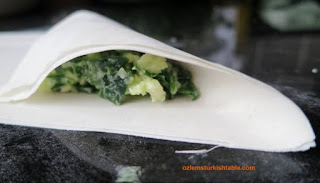 Τοποθετήστε 1 κουταλιά σούπας του μείγματος σπανάκι στο ένα άκρο της λωρίδας.