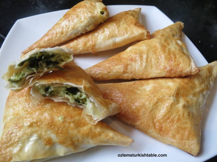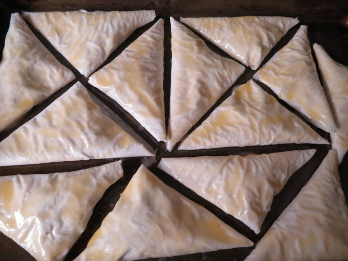 Ψήστε τα τρίγωνα στο φούρνο για περίπου 20 – 25 λεπτά, έως ότου είναι χρυσαφένια. Σερβίρετε ζεστό ως ορεκτικό ή ως μέρος ενός spread mezze. Αυτό το πιάτο μπορεί να ξαναζεσταθεί με επιτυχία.