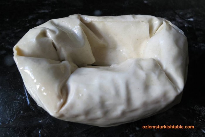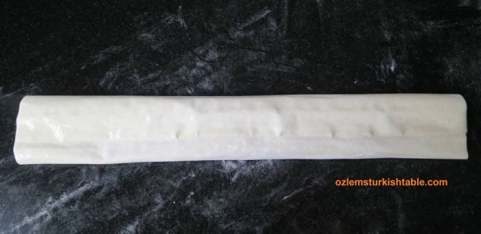 ρολό σαν ένα πούρο. Σφραγίστε τα άκρα της ζύμης με λίγο νερό.