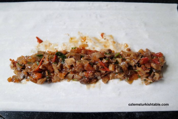 Απλώστε 1 ½ κουταλιά της σούπας μείγμα μανιταριών σε μια γραμμή μεσαία και