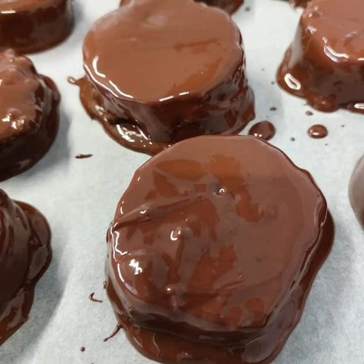 7) Λιώνω σε μπεν μαρί η στα μικροκύματα την κουβερτούρα κι όσο είναι ακόμα πολύ ζέστη βουτάω ένα ένα τα κομμάτια του γλυκού και τα αφήνω έπειτα πάνω στη λαδόκολλα