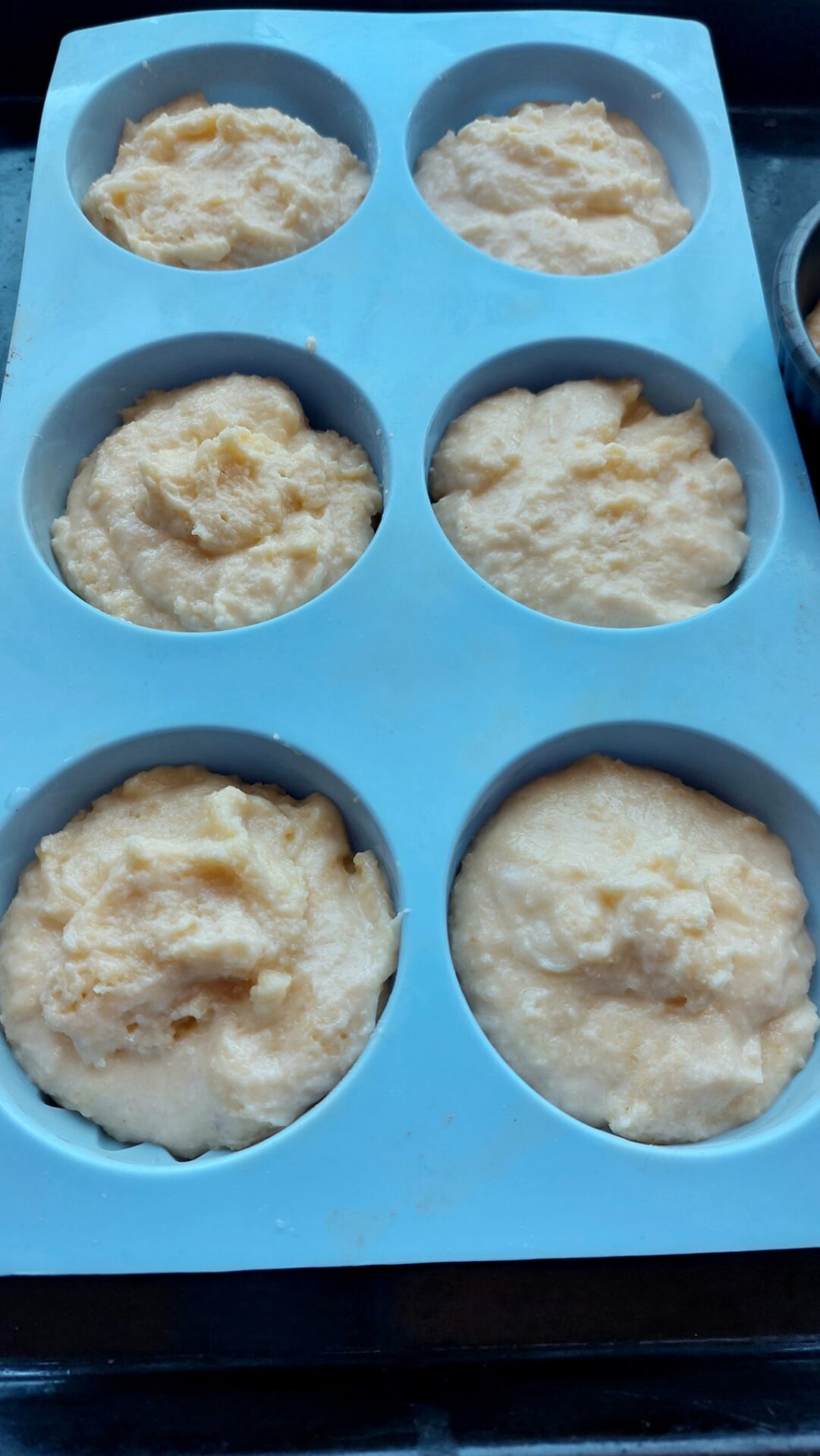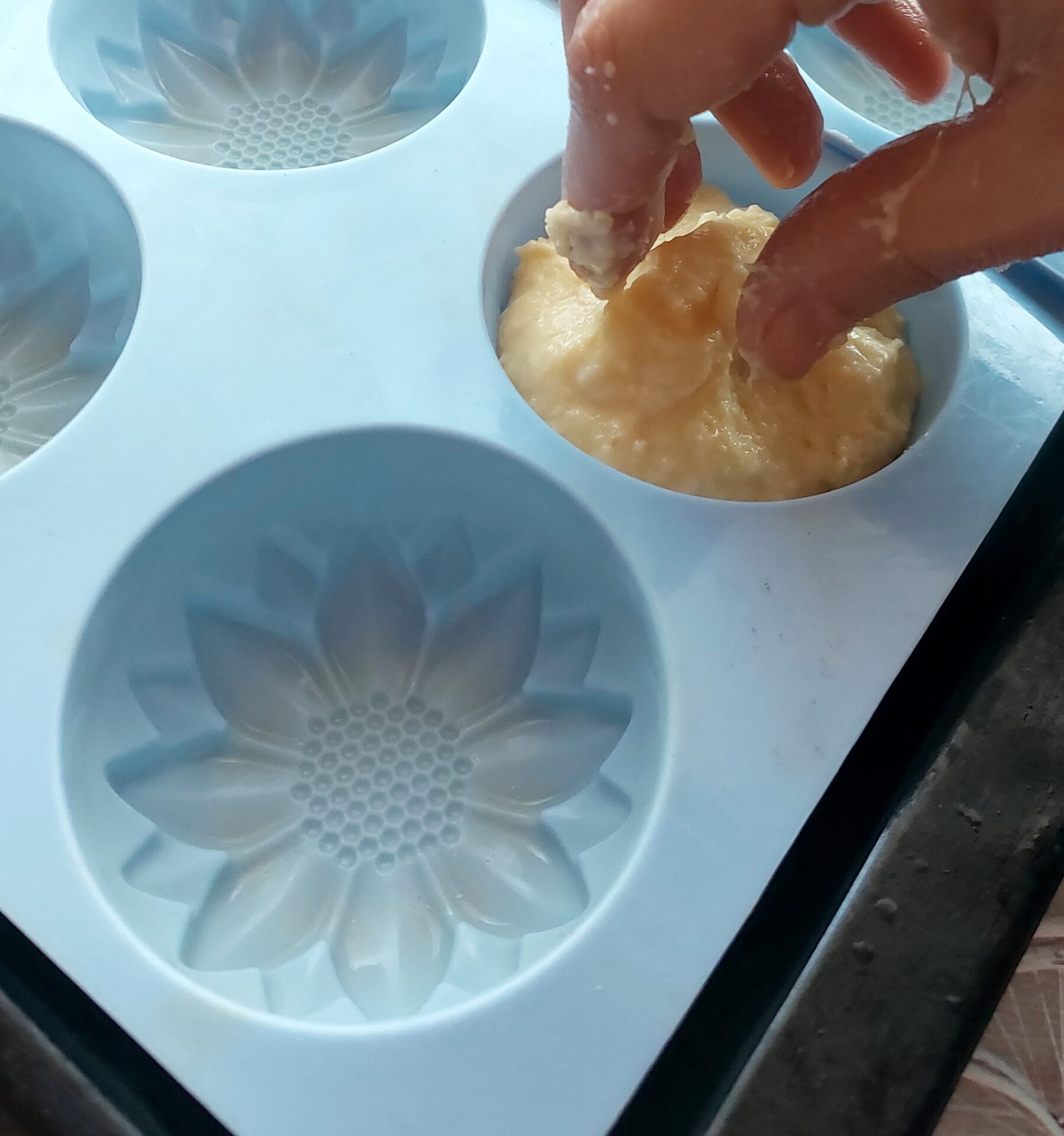 Τέλος, ζυμώνουμε με τα χέρια. Κοβουμε από τη ζύμη και βάζουμε σε φορμάκια.