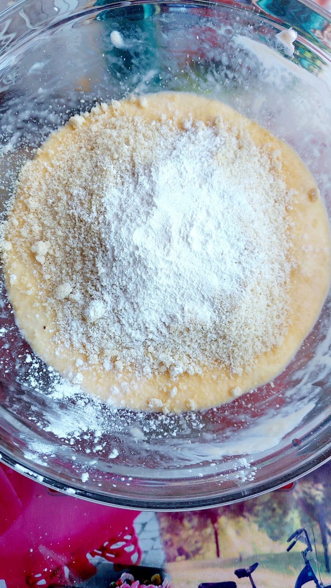 και ανακατεύουμε καλά με μια σπάτουλα. Προσθέτουμε το αλεύρι αμυγδάλου και το μπέικιν πάουντερ.