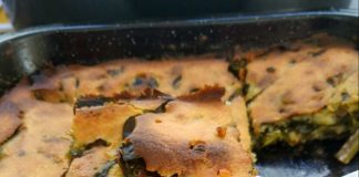 Αφήνουμε να κρυώσει ελαφρώς και κόβουμε σε κομμάτια. Σερβίρουμε πασπαλίζοντας με ζάχαρη άχνη.