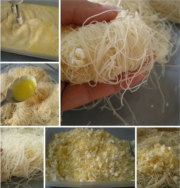 Ανοίξτε το κανταΐφι με τα δάχτυλά σας, τραβώντας τα νήματα μέχρι να διαχωριστούν και να γίνει ελαφρύ και αφράτο .
