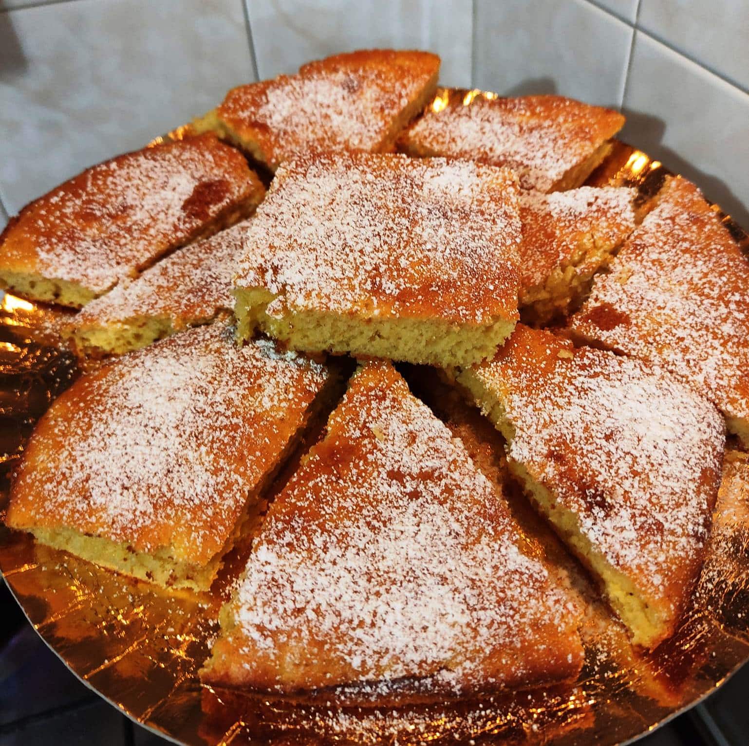 Προσθέτω τα τριμμένα μήλα, χωρίς τη φλούδα φυσικά και την κανέλα, ανακατεύω καλά με ένα κουτάλι βάζω το μείγμα στο ταψί, δεν έβαλα τίποτα λάδι ή βούτυρο γιατί δεν κολλάει, Ψήνετε στους 180° σε στατικό φούρνο περίπου 20_25 λεπτά. Βγάζουμε από το φούρνο αφήνουμε λίγο να κρυώσει και πασπαλίζουμε με άχνη ζάχαρη