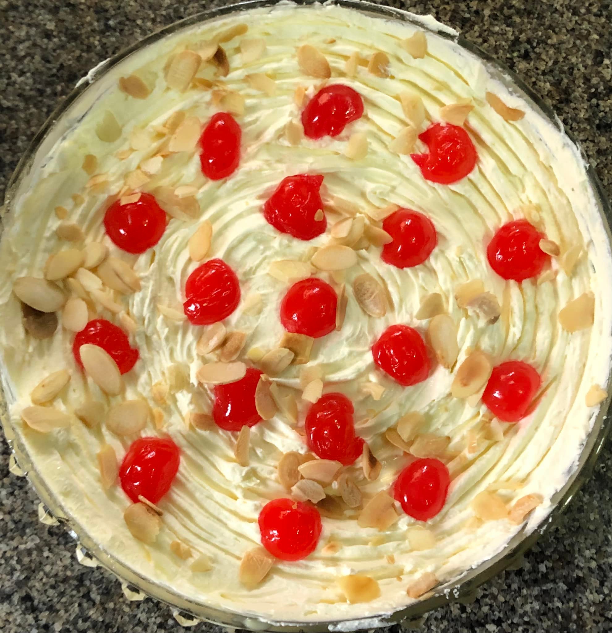 Χτυπάμε τη κρέμα γάλακτος μέχρι να σφίξει και την απλώνουμε με το κουτάλι πάνω στην κρέμα……με ένα πιρούνι καντε τα σχεδια που θέλετε Κόψτε και βάλτε τα υπόλοιπα κεράσια μαρασκίνο πάνω στην κρέμα