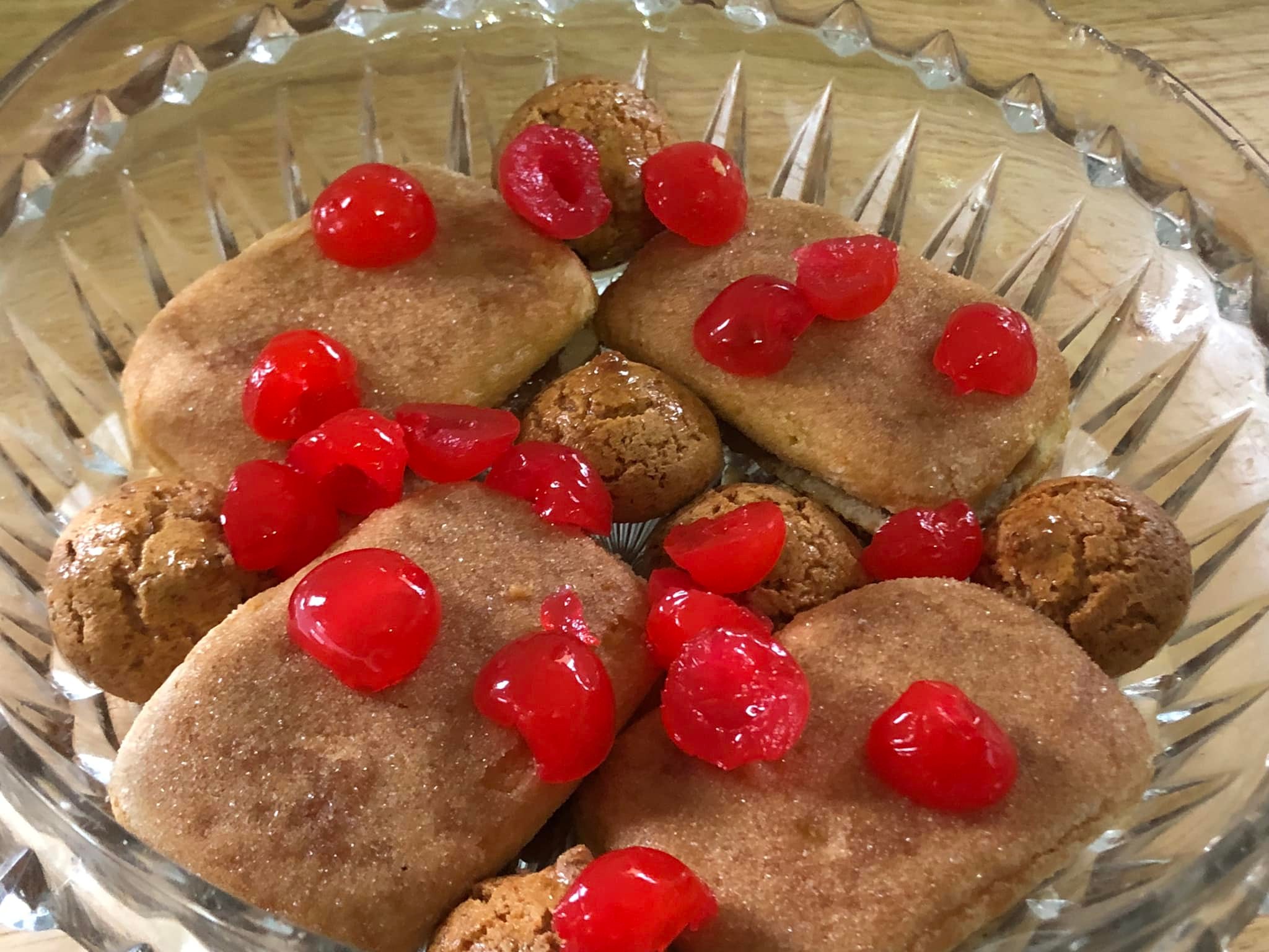 Πασπαλίζουμε τα κομμένα κεράσια μαρασκίνο πάνω από τα παντεσπάνια και τα μπισκότα……