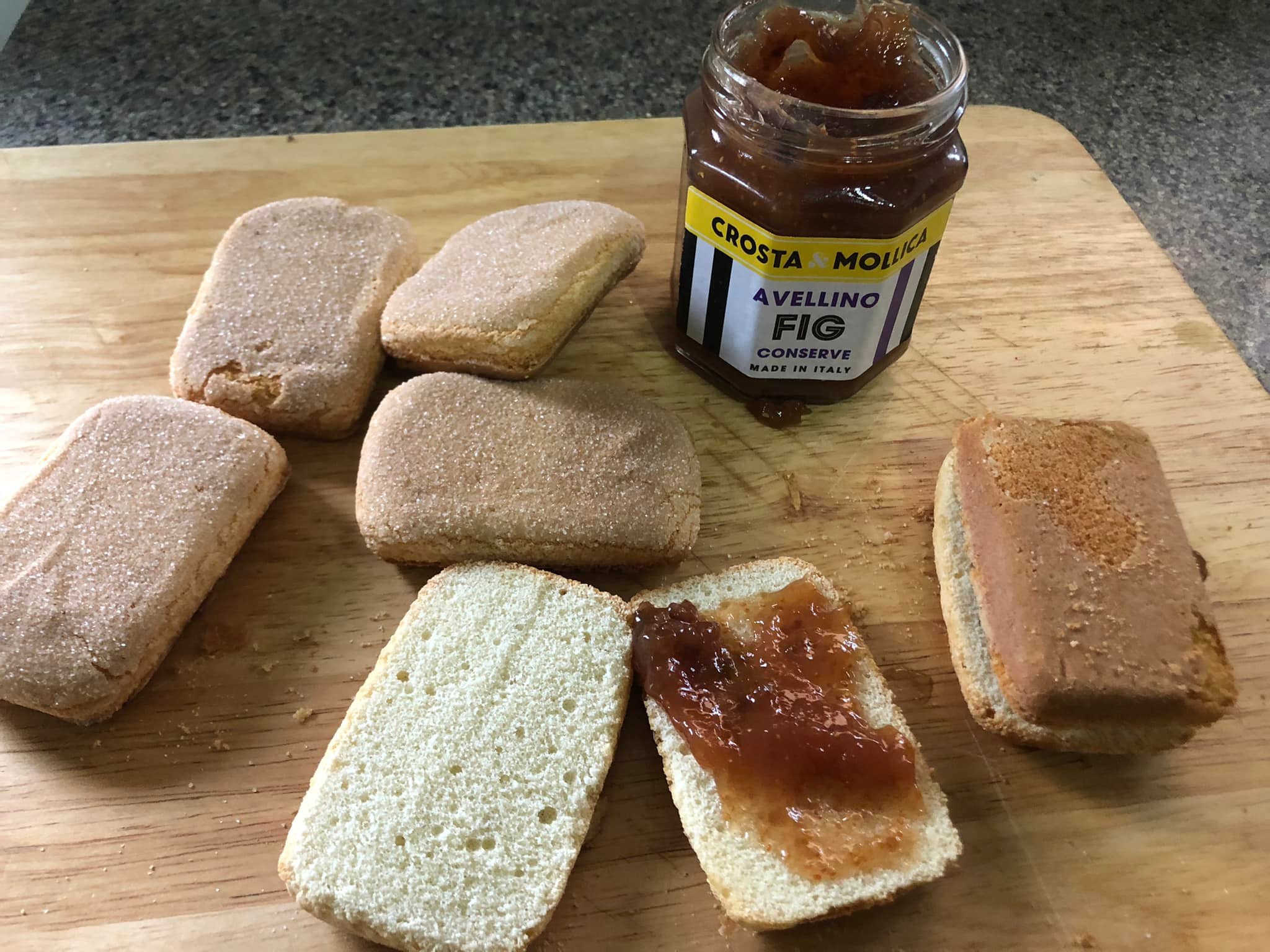 Χωρίζουμε τα παντεσπάνια-σαβαγιαρ στη μέση και απλώνουμε τη μαρμελαδα σύκου στο ένα μισό και τα κάνουμε ένα σάντουιτς με το πάνω μισό.