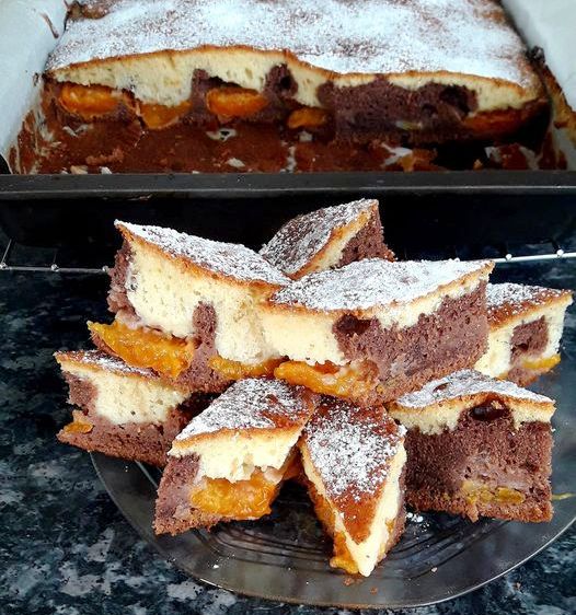 Στο ταψί στρωμένο με χαρτί ψησίματος και στα τοιχώματα, έβαλα στο κάτω μέρος το κακάο και μετά τοποθέτησα τα βερίκοκα κομμένα στη μέση σε όλη την επιφάνεια και μετά σκέπασα με το κίτρινο μέρος του μειγματος. Ρίχνω ένα κουταλάκι του γλυκού ακατέργαστη ζάχαρη αναμεμειγμένη μεμισό κουταλάκι του γλυκού κανέλα σε σκόνη από πάνω.