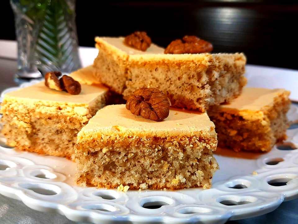 Χτυπάμε τα ασπράδια με την ζάχαρη μέχρι να γίνει μία μαρεγκα. Προσθέστε το βούτυρο (λάδι), τα καρύδια, το μπέικιν πάουντερ τον χυμό λεμονού και το ξύσμα λεμονιού. Ανακατέψτε καλά με κινήσεις από κάτω προς τα πάνω.