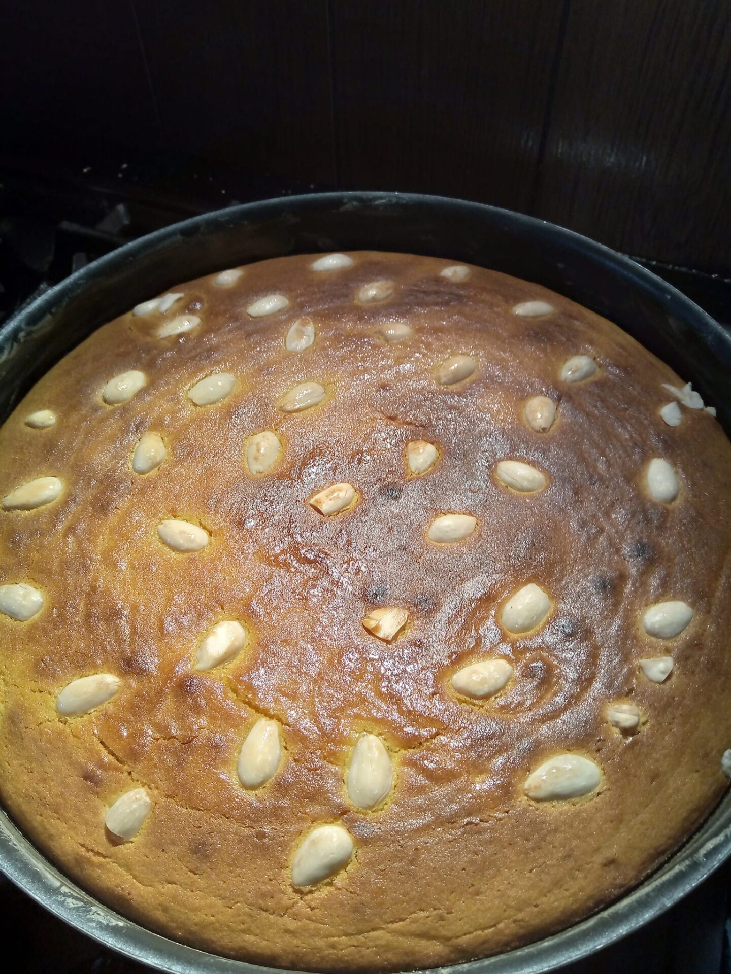 Αλείψτε ένα μεγάλο ταψί για κεικ με ταχίνι. Ρίξτε τη ζύμη του κέικ και προσθέστε τα καθαρισμένα αμύγδαλα ή το κουκουνάρι ώστε να βγαίνουν σε κάθε κομμάτι