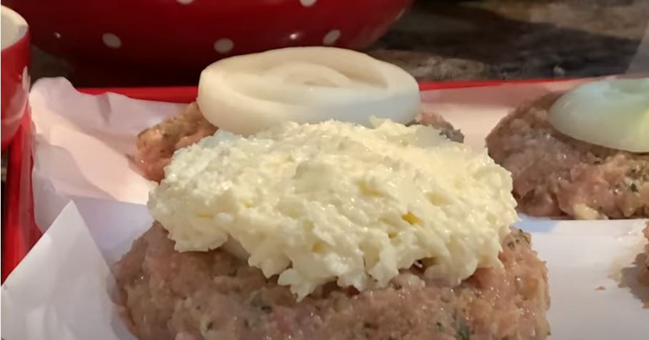 5. Πάρτε το κομμένο σε φέτες κρεμμύδι και τοποθετήστε το πάνω από τα μπιφτέκια κοτόπουλου