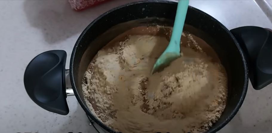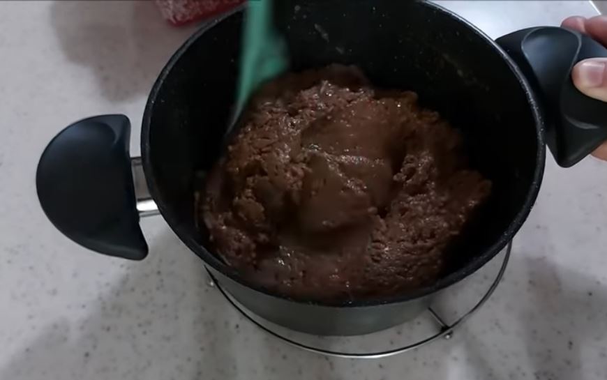 Κατεβάζουμε από τη φωτιά την κατσαρόλα προσθέτουμε το τριμμένο μπισκότο και ανακατεύουμε έως ότου ενσωματωθεί και γίνει μία σοκολατένια πάστα.