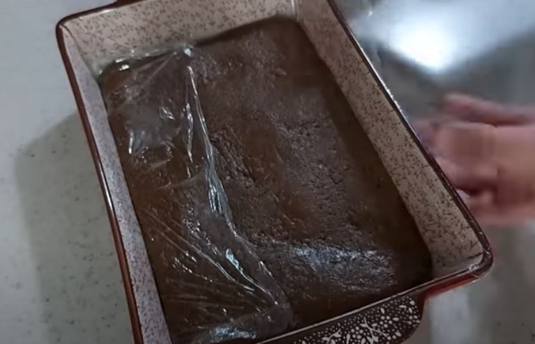 Σε ένα πυρεξ όχι μεγάλο το έχουμε στρώσει με μία μεμβράνη και αδειάζουμε την πάστα και την ισιώνουμε να καλύψει όλη τη βάση.